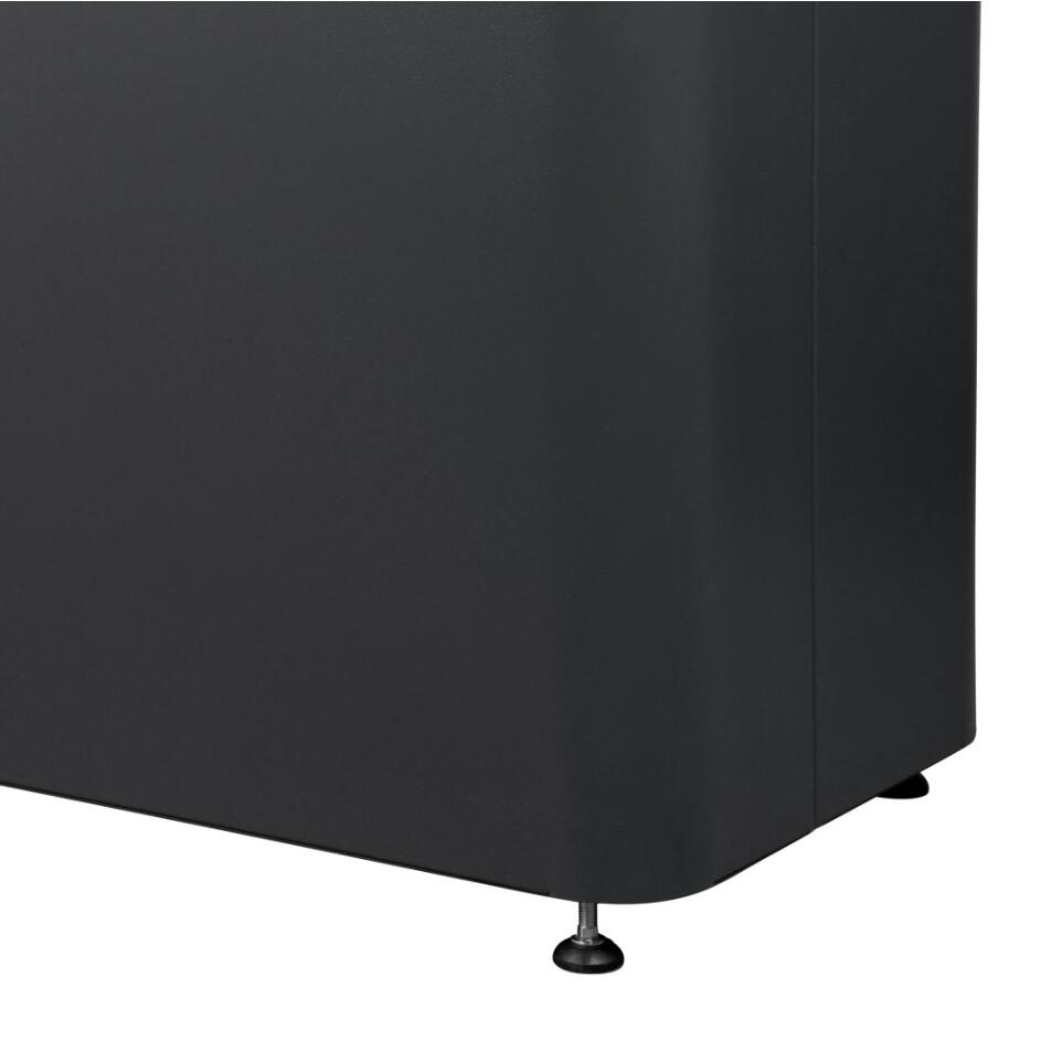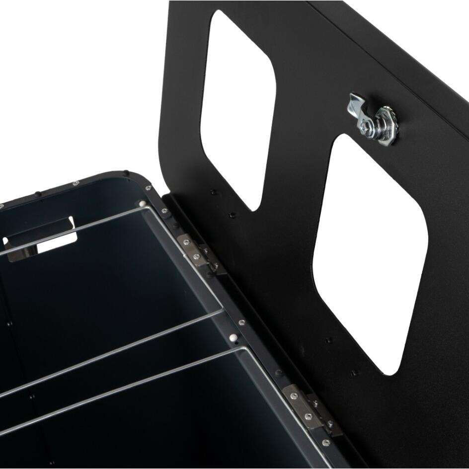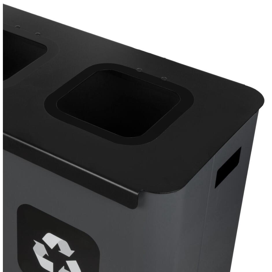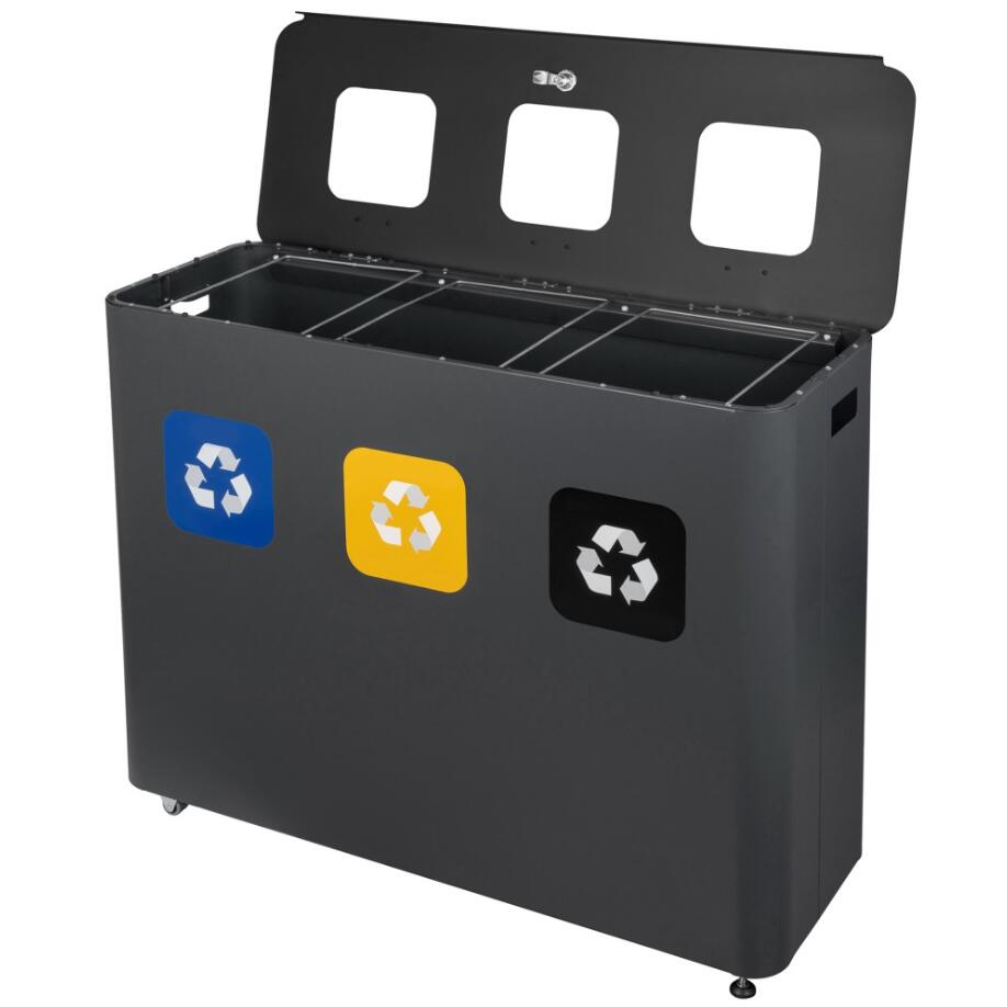 Corpul stației, fabricat din oțel galvanizat, vopsit în câmp electrostatic, într-o elegantă culoare antracit, garantează o durabilitate excepțională și rezistență la deteriorare. Capacul negru acoperă întregul corp și este echipat cu trei fante de intrare pentru deșeuri marcate cu rame colorate, conform instrucțiunilor Ministerului Mediului. Aceste marcaje permit utilizatorilor să sorteze intuitiv deșeurile în compartimentele corespunzătoare.
