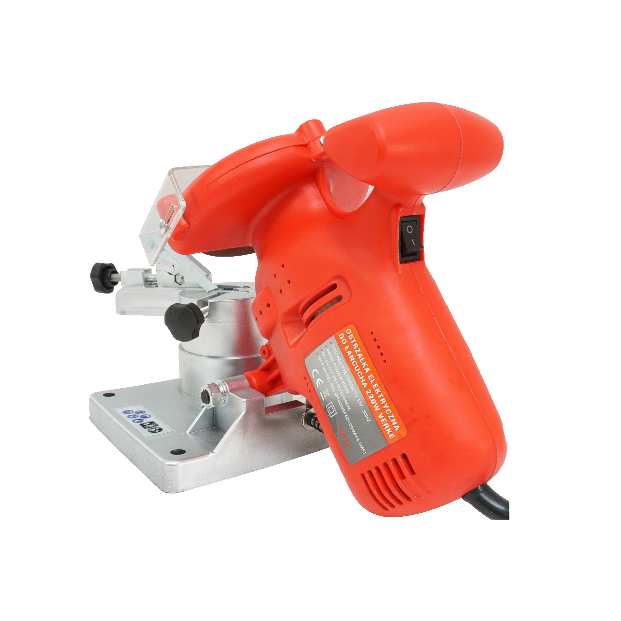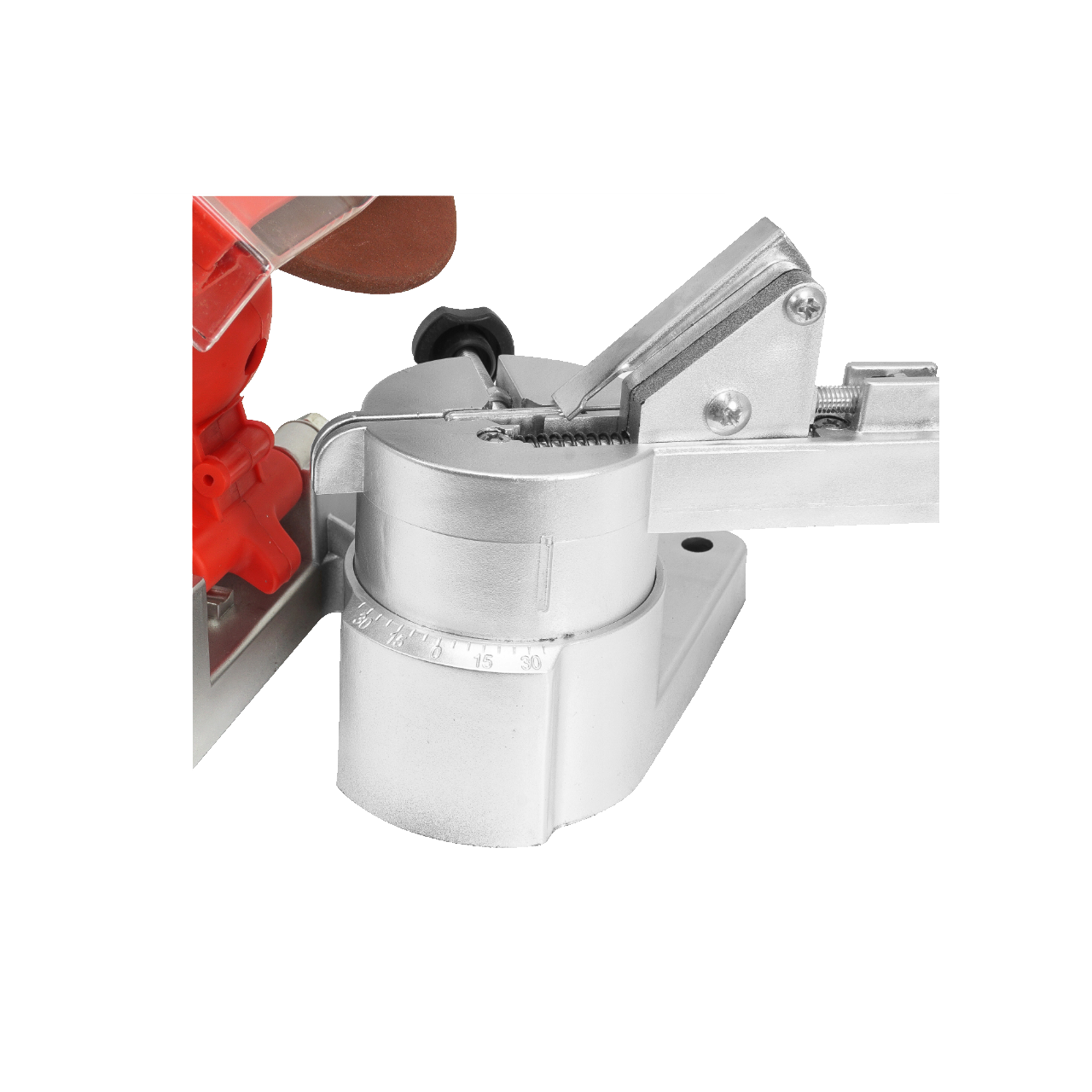 Acest ascuțitor are un motor puternic de 220 W, o lamă cu diametrul de 100 mm și o menghină rotativă cu unghi de ascuțire reglabil, permițând o ascuțire ușoară și eficientă a lanțurilor.