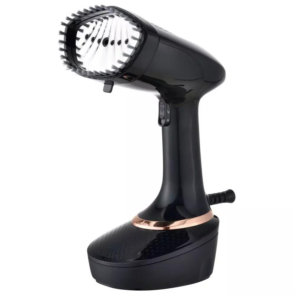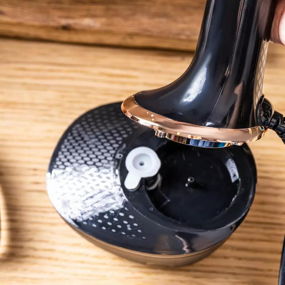 Aparat de calcat cu abir pentru haine și țesături, într-o culoare neagră elegantă cu panou auriu. Este un dispozitiv modern care oferă eficiență și comoditate în îngrijirea textilelor pentru dulap și casă. Datorită tehnologiei avansate cu abur, dispozitivul nu numai că elimină cutele, ci și împrospătează țesăturile, dezinfectează și redă prospețimea chiar și celor mai solicitante țesături. Designul elegant și soluțiile practice fac din acest aparat cu abur ideal atât pentru uz casnic, cât și pentru călătorii.