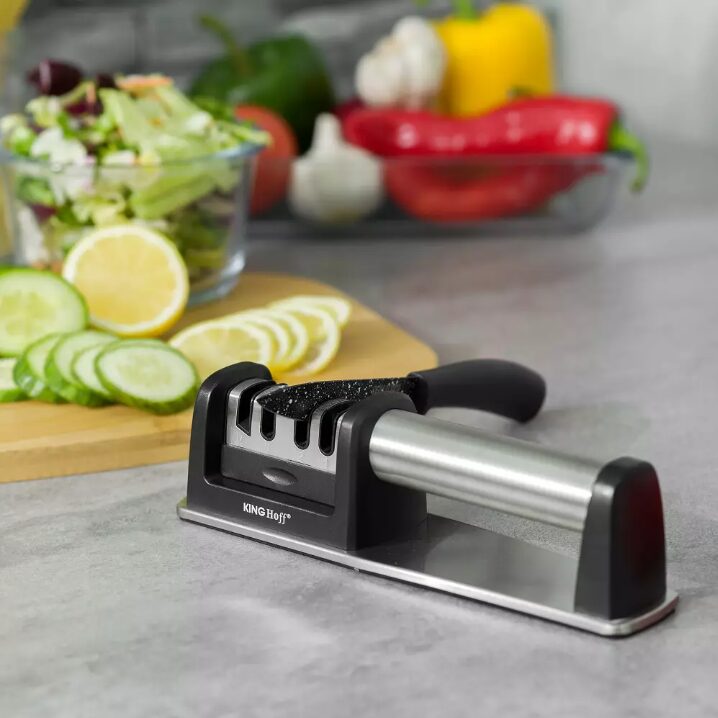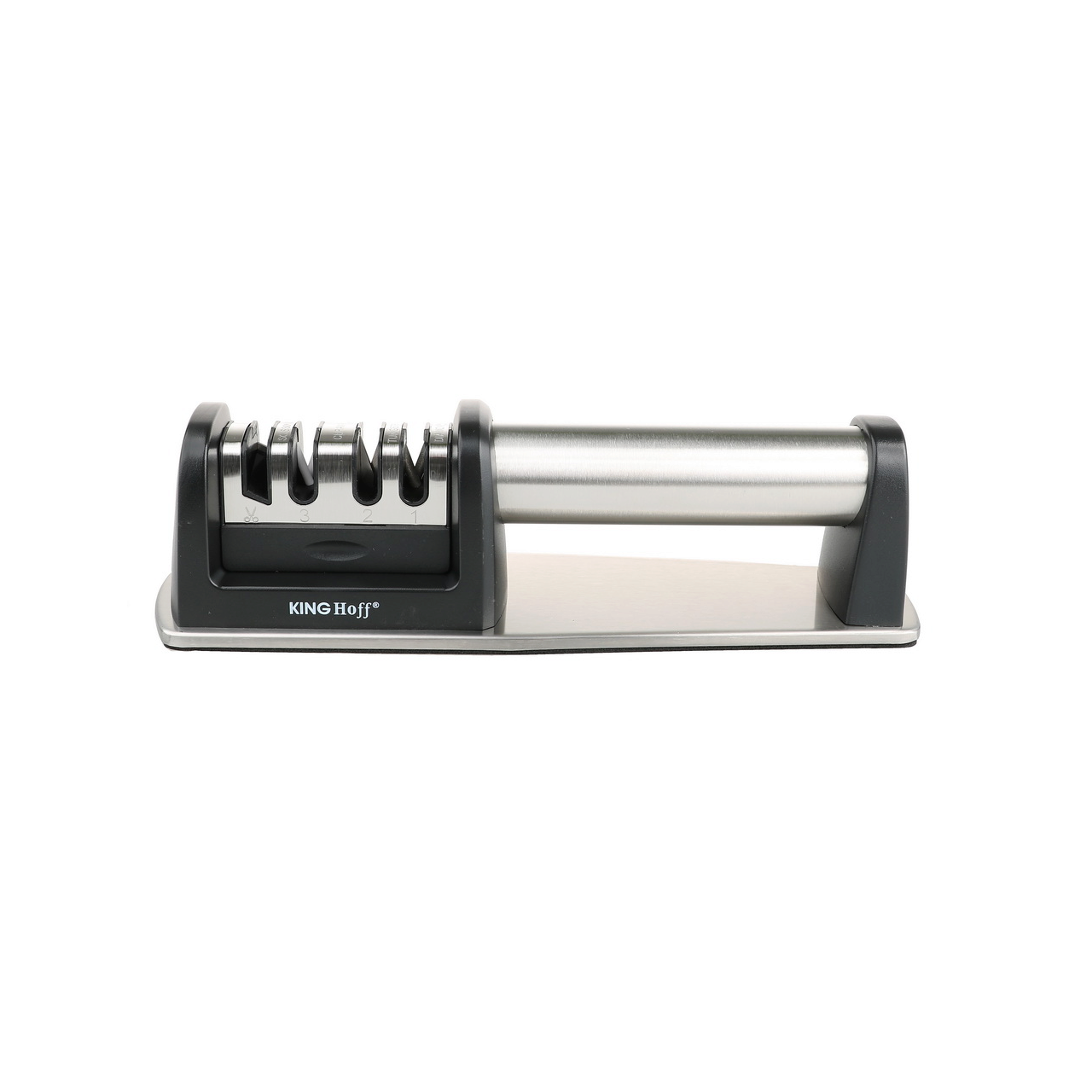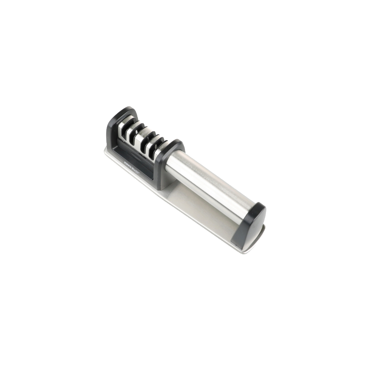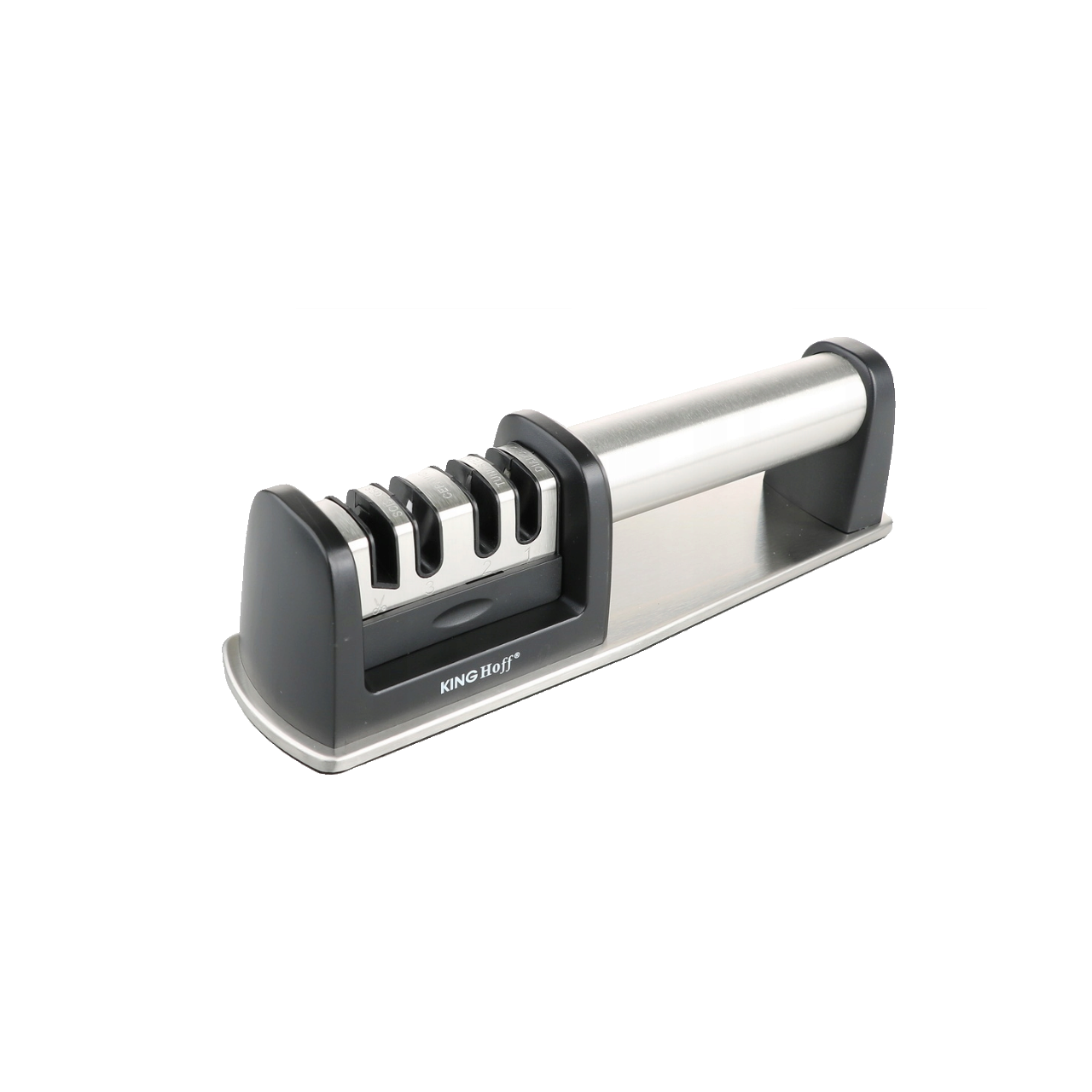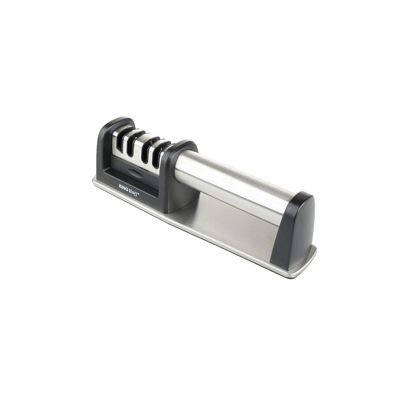 Ascuțitoareal de cuțite este echipata cu un mâner ergonomic pentru confort și siguranță și o bază de cauciuc anti-alunecare pentru a menține stabilitatea în timpul ascuțirii.