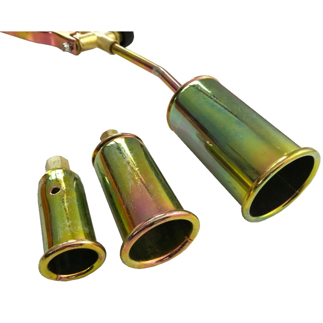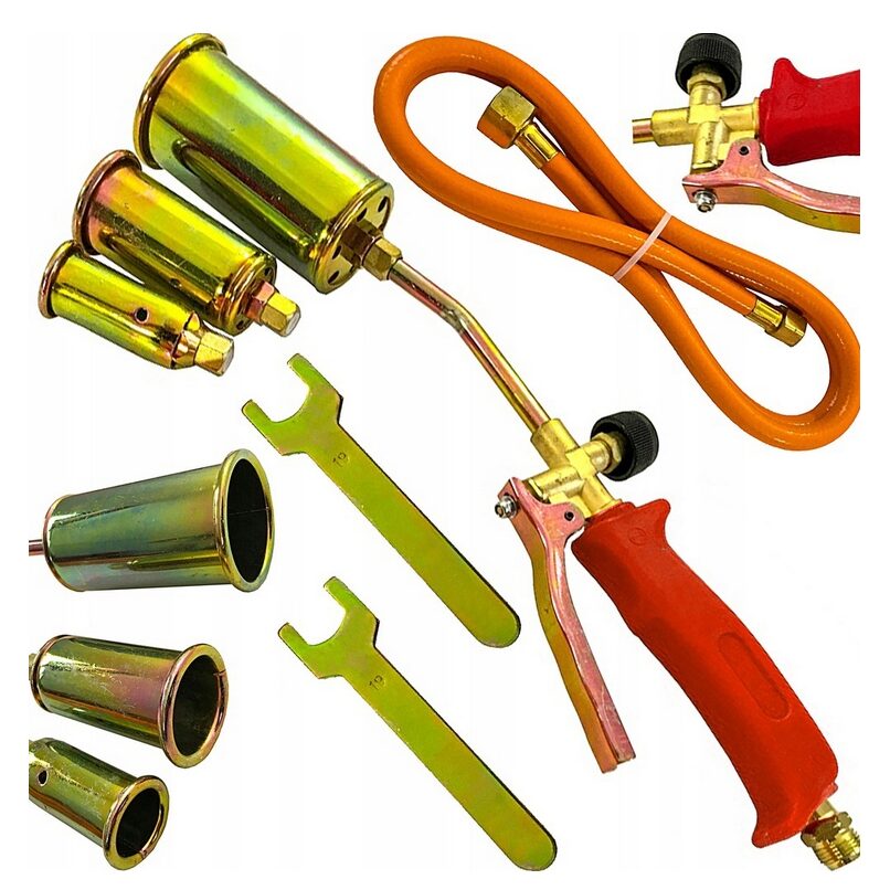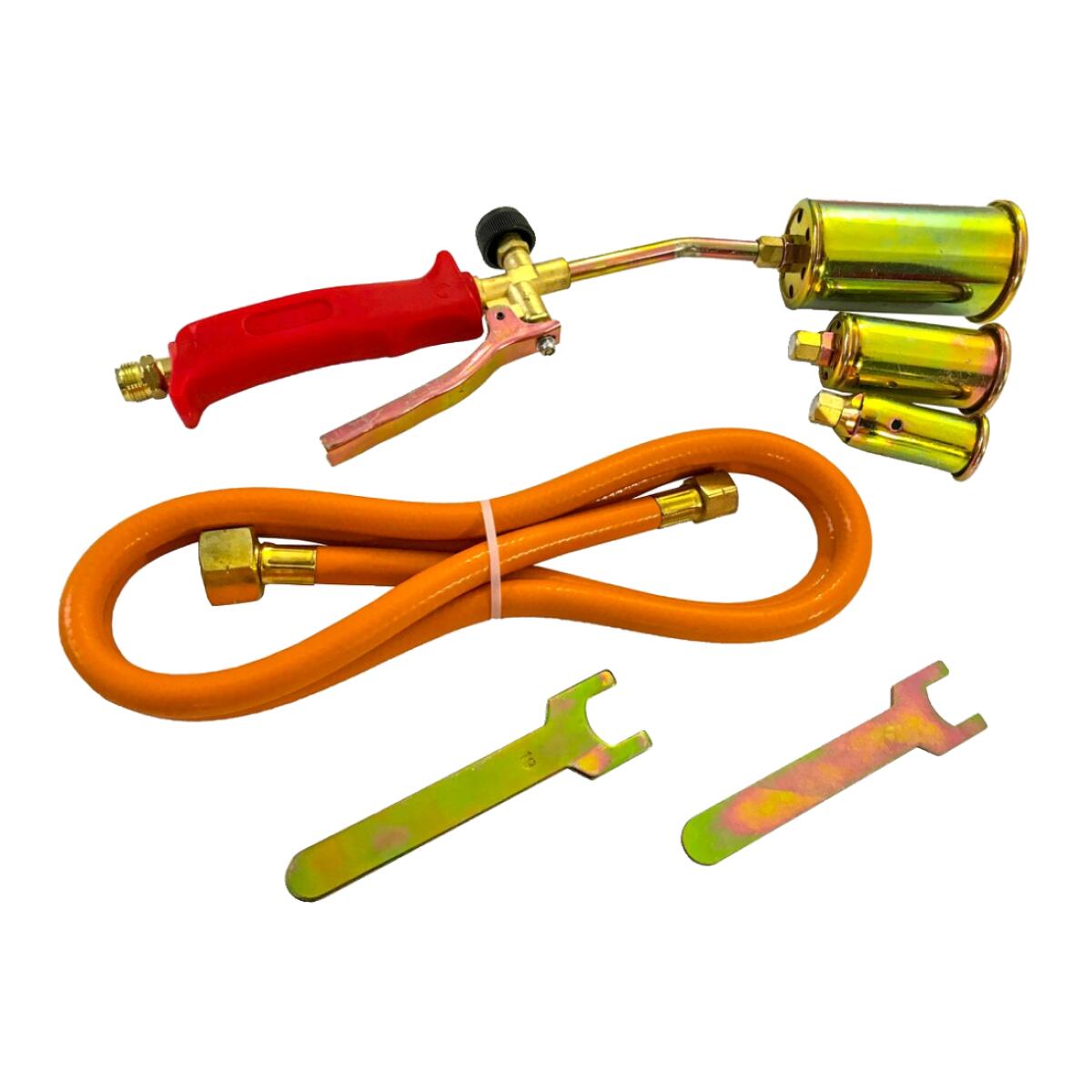 Setul include un mâner cu o pârghie de supapă economică, un furtun cu racorduri pentru cilindru și mâner și trei duze de flacără pentru încălzire intensivă sau bronzare.
