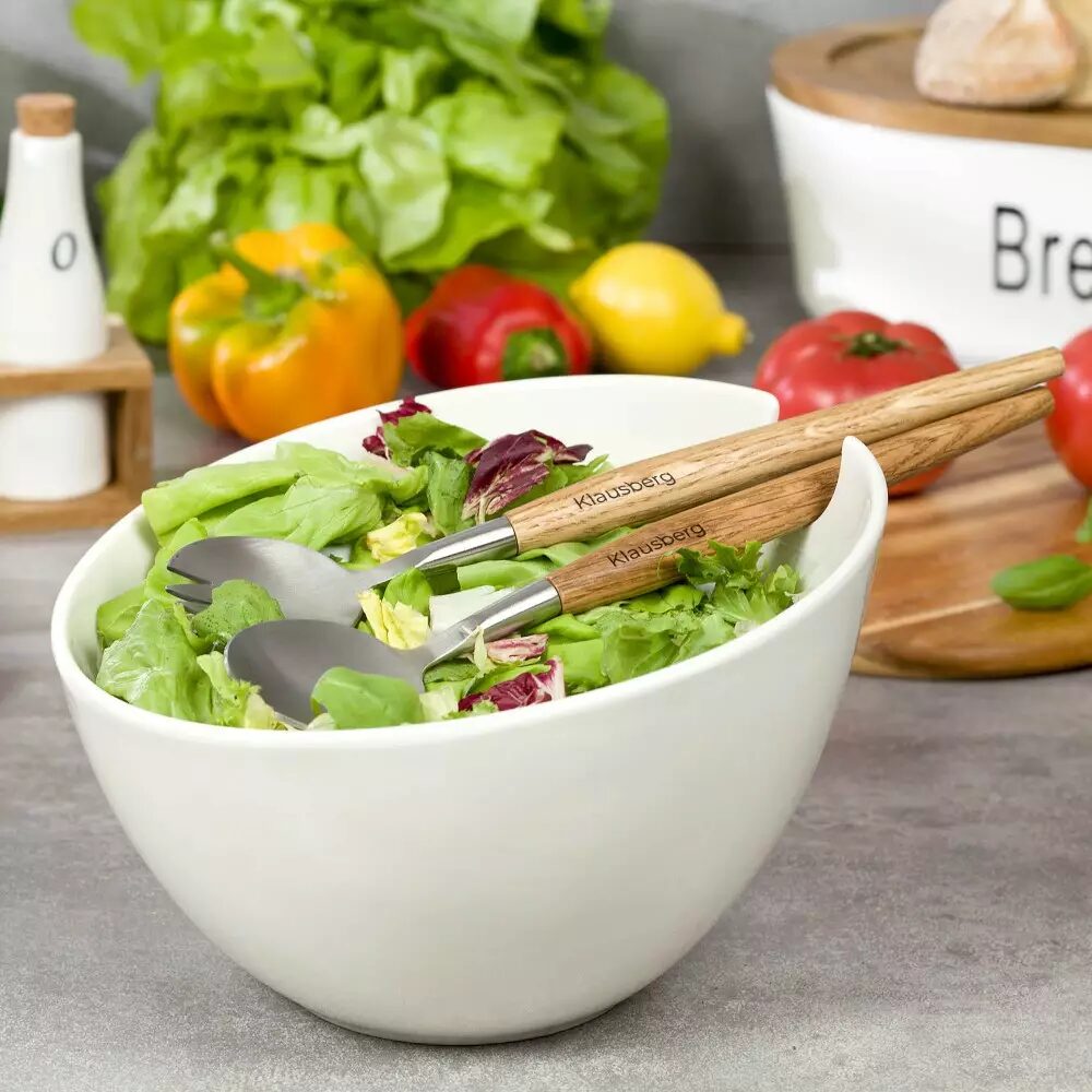 Bol de salata din ceramica, 23.5 cm, alb, cu un set de linguri cu manere din lemn, Klausberg