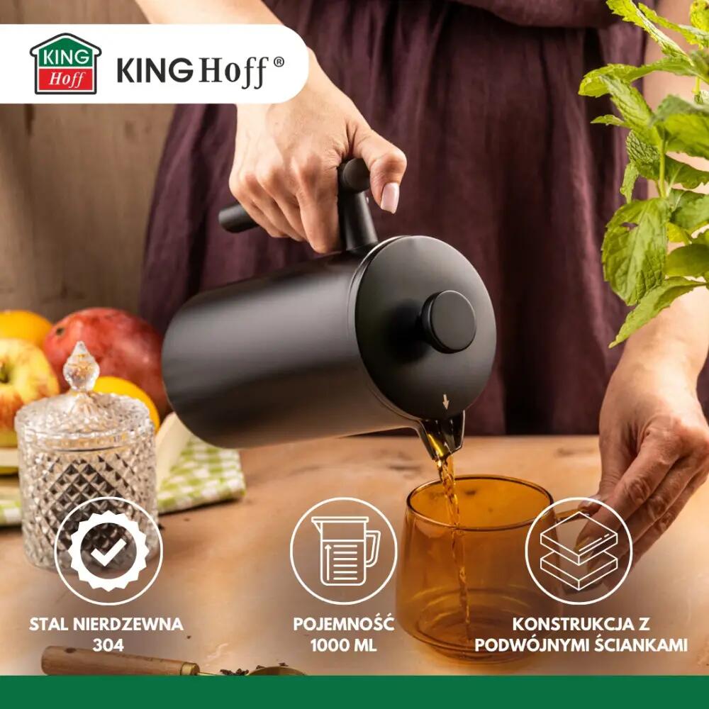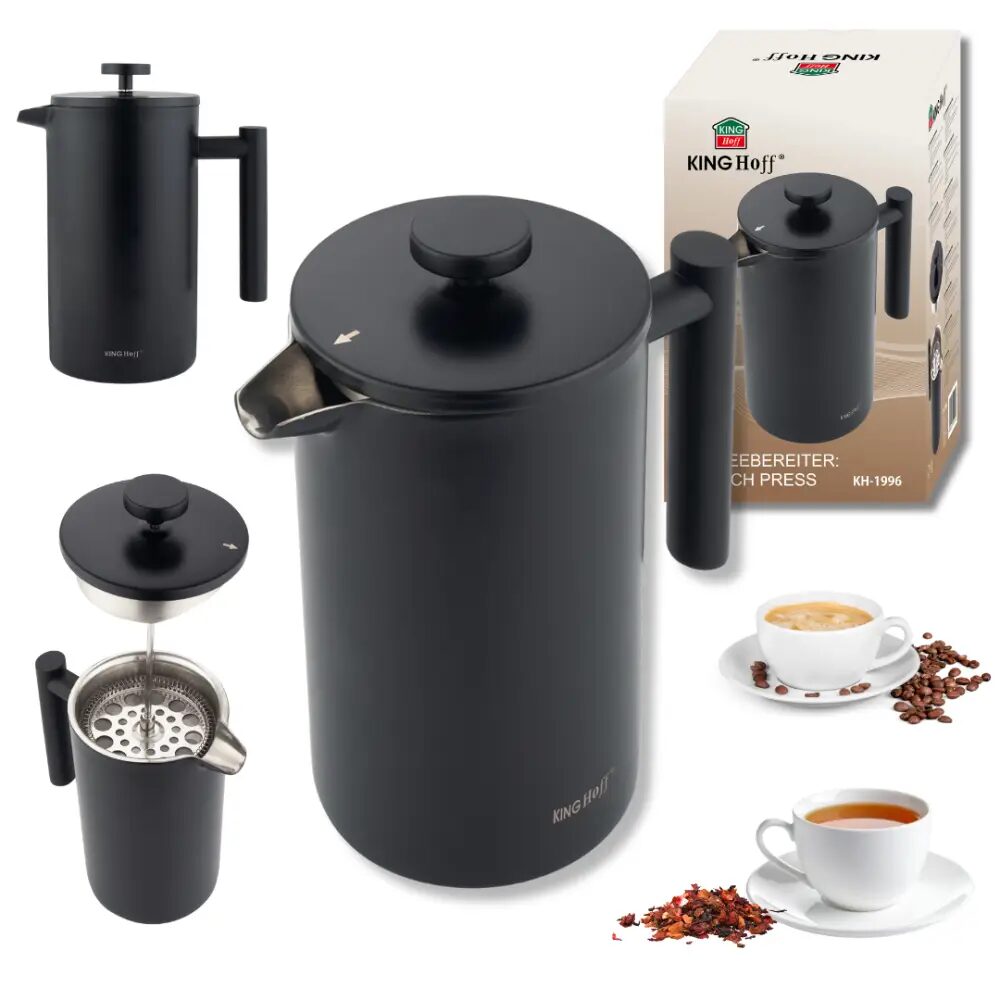 Modelul KINGHoff KH-1996 este o presă franceză modernă, de culoare neagră mat, concepută pentru persoanele care doresc să se bucure de aroma intensă a cafelei și a ceaiului, același timp aspectul elegant și de design al accesoriilor de bucătărie. Fabricată din oțel inoxidabil 304 și echipată cu pereți dubli, menține perfect temperatura cafelei, oferind confort în utilizare acasă, la birou, la restaurant sau la cafenea.