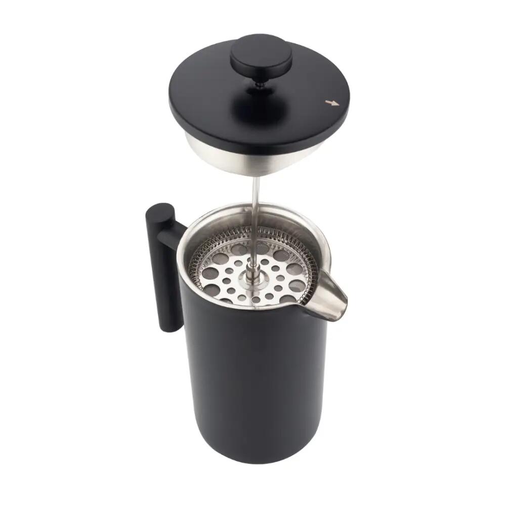 Presa franceză KH-1996 se distinge prin durabilitate, materiale robuste și estetică elegantă. Învelișul negru mat îi conferă un aspect luxos, în timp ce oțelul inoxidabil 304 garantează rezistență la coroziune și neutralitate a gustului. Pereții dubli mențin cafeaua caldă mult mai mult timp, iar mânerul confortabil și gura de scurgere precisă facilitează utilizarea zilnică.