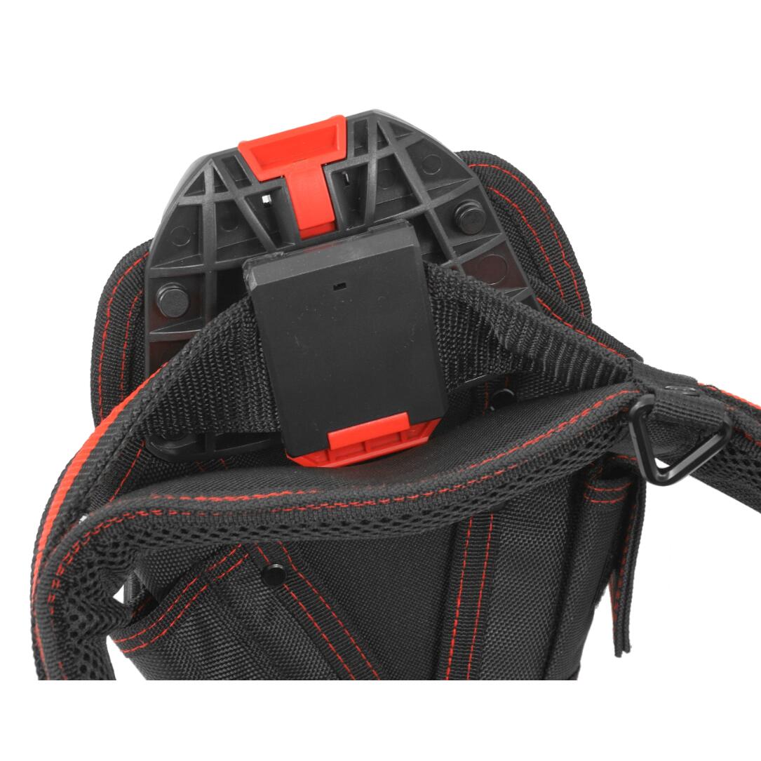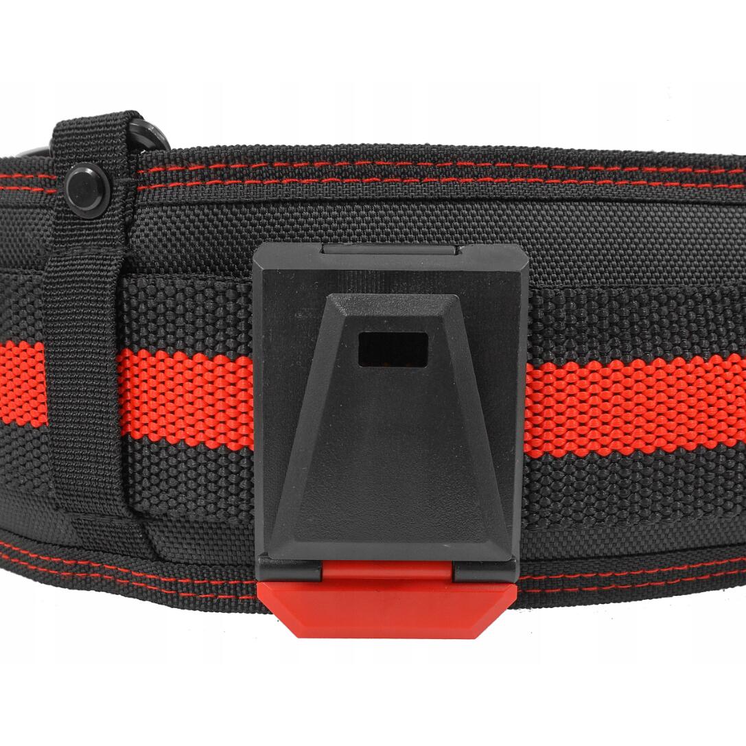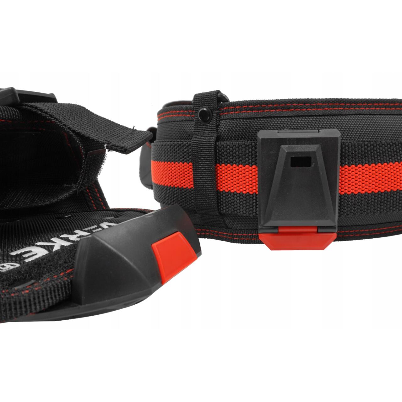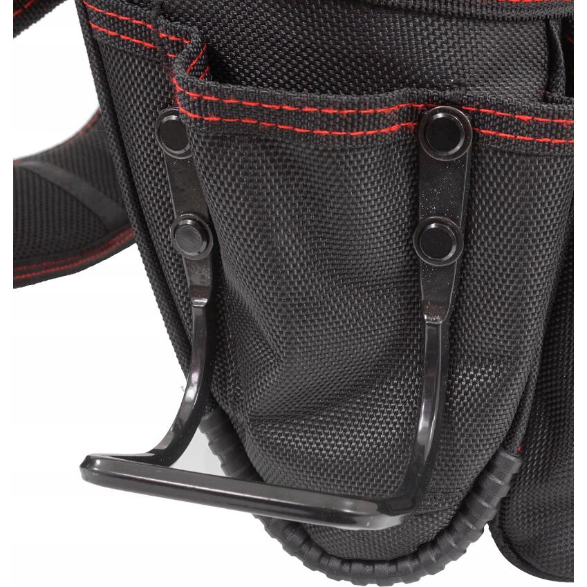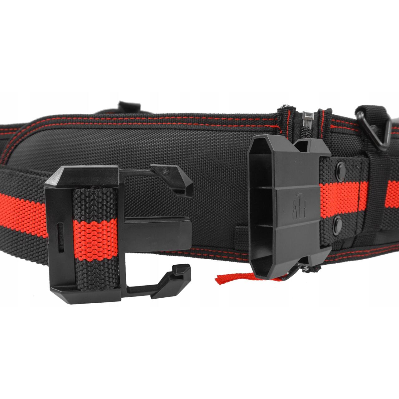 Curea pentru scule cu două buzunare glisante cu numeroase incaperi și o buclă pentru ciocan. Fiecare geantă se atașează la un mâner cu clic. Curea ergonomică puternică prinsă cu Velcro, fermoar și prinsă suplimentar cu cataramă. Are suporturi pentru montarea hamurilor. Material: poliester 1680D. Țesăturile cu țesături 1680D sunt printre cele mai durabile materiale.
