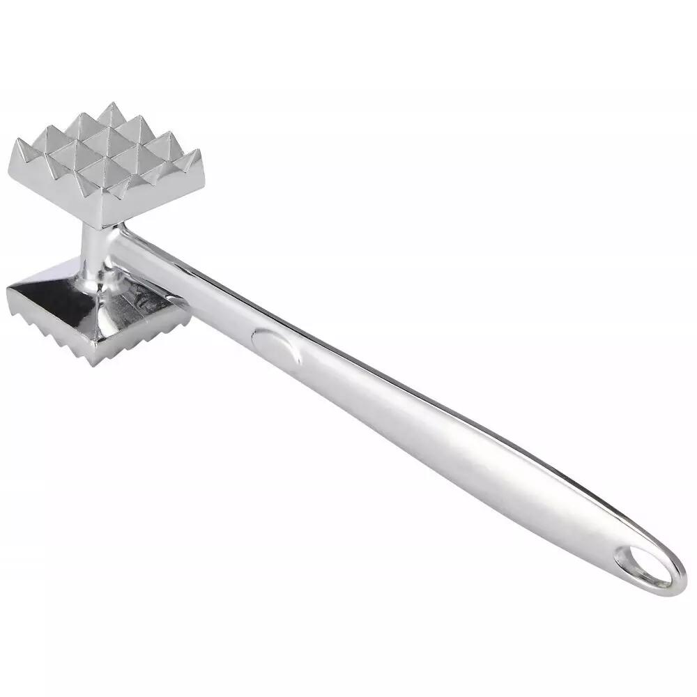 Ciocan pentru carne din inox. Ciocan cu două fețe are tăieturi groase pe o parte și tăieturi fine pe cealaltă.