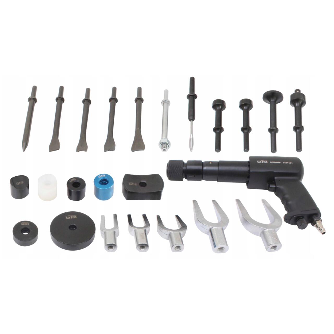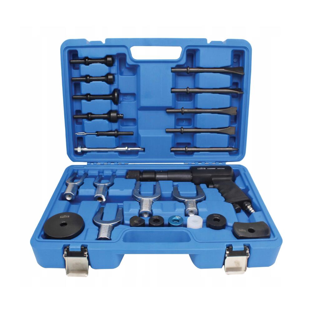 Un set extins de adaptoare concepute pentru a slăbi conexiunile blocate folosind vibrațiile generate de ciocanul pneumatic inclus în set.