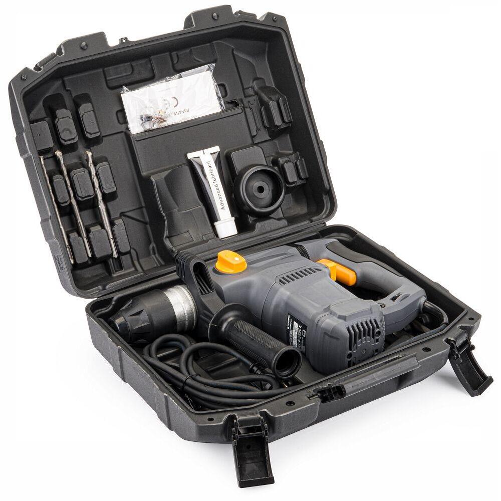 Ciocan de demolare POWERMAT PM-MU-2600M cu puterea de 2600W cu sistemul de montare a burghiului SDS-plus. Sistemul de mâner antivibrație AVH reduce vibrațiile generate în timpul utilizării.