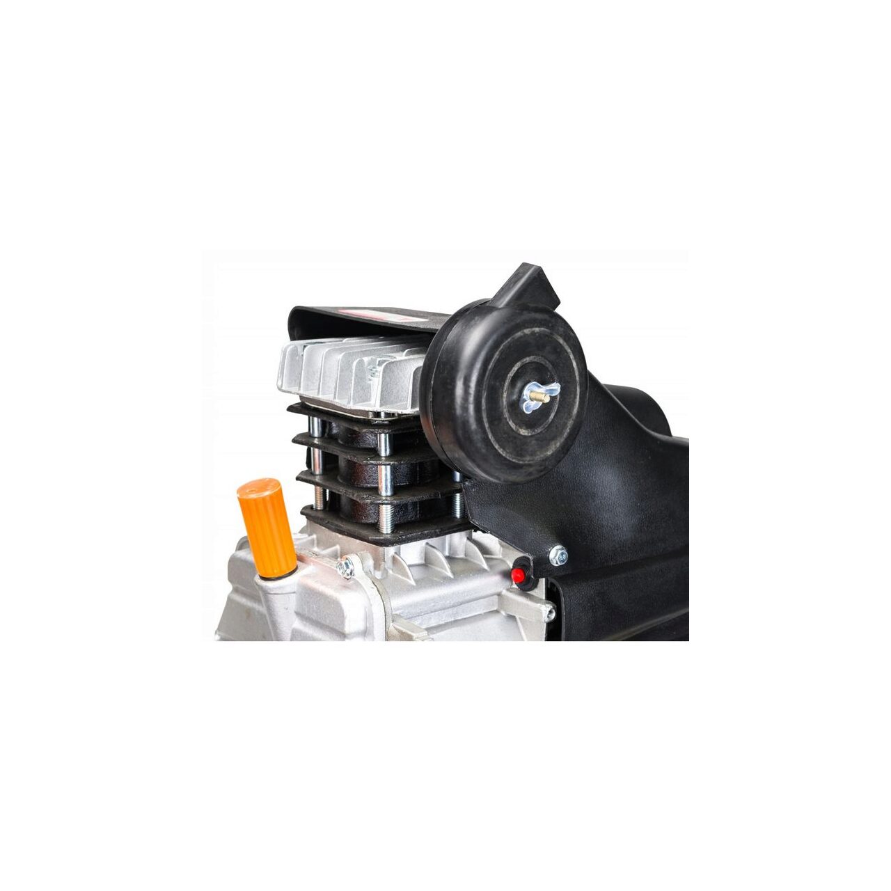 Dispozitivul are 2 ieșiri pe conectorii rapizi standardizați „EURO”, una dintre acestea fiind reglată cu ajutorul unui reductor integrat care arată presiunea de lucru pe manometru. A doua ieșire dă presiune completă din rezervor, apoi manometrul arată presiunea curentă din rezervor. Comutatorul de presiune este setat la o presiune maximă de 8 bar, când presiunea din rezervor atinge această valoare, compresorul se oprește, reactivarea are loc atunci când presiunea din rezervor scade sub 6 bar. Siguranța în cazul defecțiunii / blocării presostatorului este asigurată de o supapă de siguranță certificată. Ceea ce va funcționa dacă se depășește presiunea sigură în rezervor, scăzând excesul dacă este necesar. Rezervorul compresorului este zincat pe interior și exterior. Cilindrul este echipat cu o supapă de scurgere pentru a scurge apa acumulată, care o protejează împotriva coroziunii. Mobilitatea dispozitivului este asigurată de roți confecționate dintr-un material rezistent termic, acoperit cu o acoperire din cauciuc rezistent la abraziune. Un mâner suplimentar de transport facilitează deplasarea compresorului în zona de lucru. Uleiul de compresor în timpul transportului în poziție greșită poate ieși prin filtrele de aer, care în multe cazuri provoacă probleme cu funcționarea corectă a acestuia. Avem grijă de clienții noștri și de echipamentele lor, motiv pentru care compresoarele pe care le comercializăm nu sunt inundate cu ulei, ceea ce îi protejează în timpul transportului. Uleiul este livrat într-o sticlă separată, într-o cantitate adecvată măsurată pentru prima aplicare.