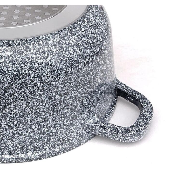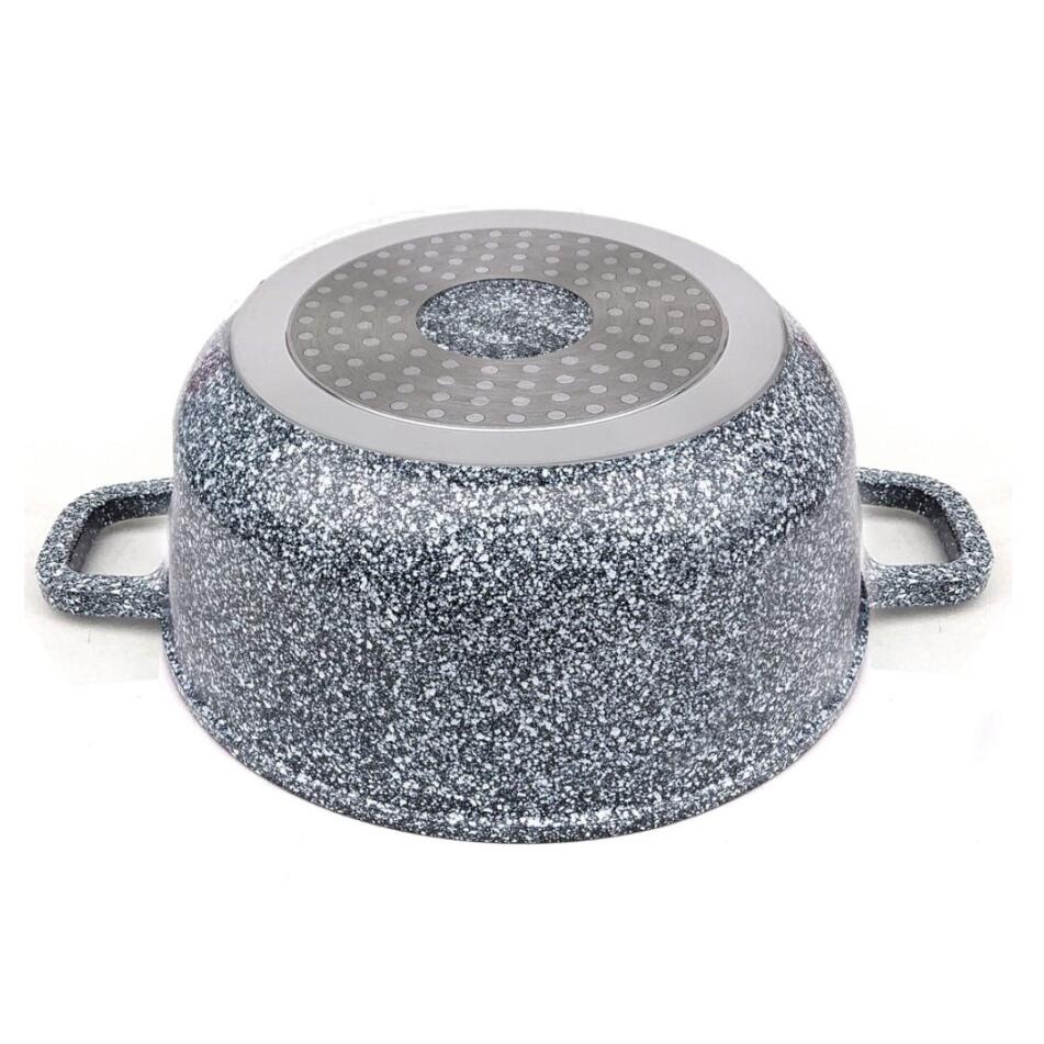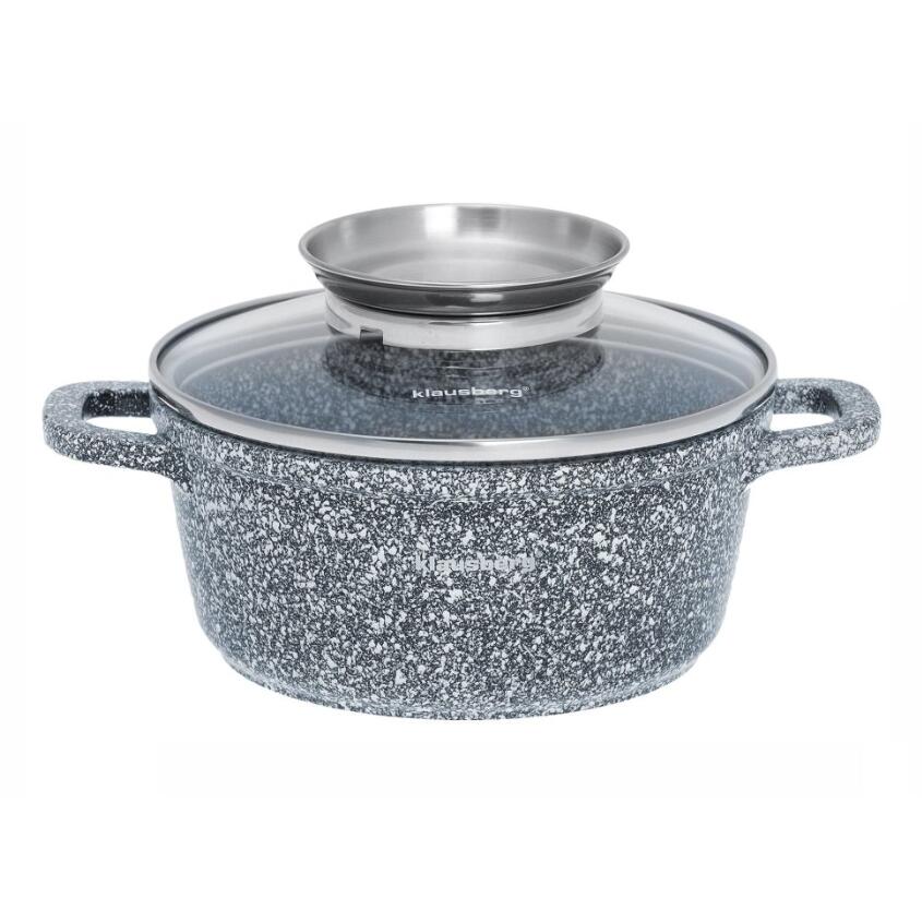 Oală KLAUSBERG acoperită cu un strat antiaderent de marmură ceramică. Echipat cu un capac de sticlă cu mâner Aroma Knob în care este plasat un dozator de ulei, datorită căruia poți servi ulei sau condimente lichide în timpul gătitului sau tocăturilor. Oalele din această serie din aliaj de aluminiu au un fund feromagnetic inductiv. Sunt adaptate pentru a funcționa cu orice tip de bucătărie, inclusiv cu inducție.