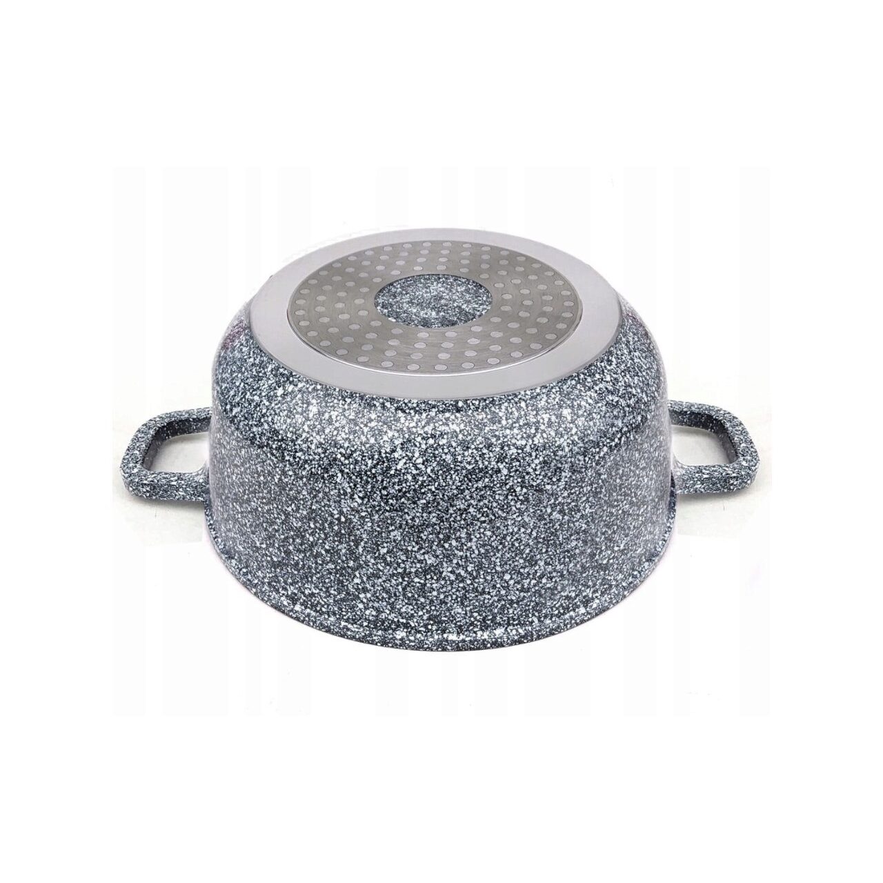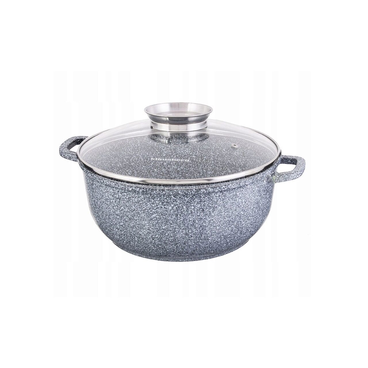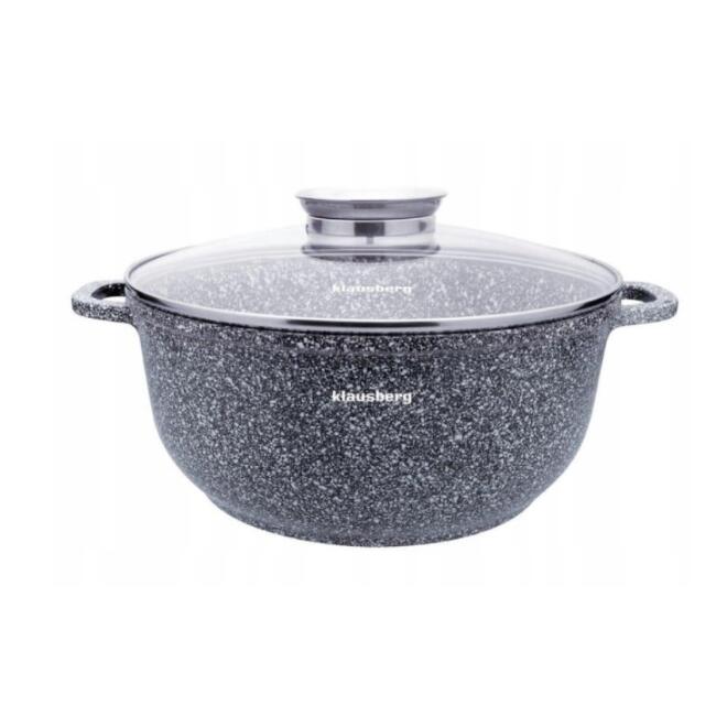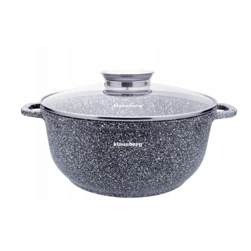 Oală KLAUSBERG acoperită cu un strat antiaderent de marmură ceramică. Echipat cu un capac de sticlă cu mâner Aroma Knob în care este plasat un dozator de ulei, datorită căruia poți servi ulei sau condimente lichide în timpul gătitului. Oalele din această serie din aliaj de aluminiu au un fund feromagnetic inductiv. Sunt adaptate pentru a funcționa cu orice tip de bucătărie, inclusiv cu inducție.