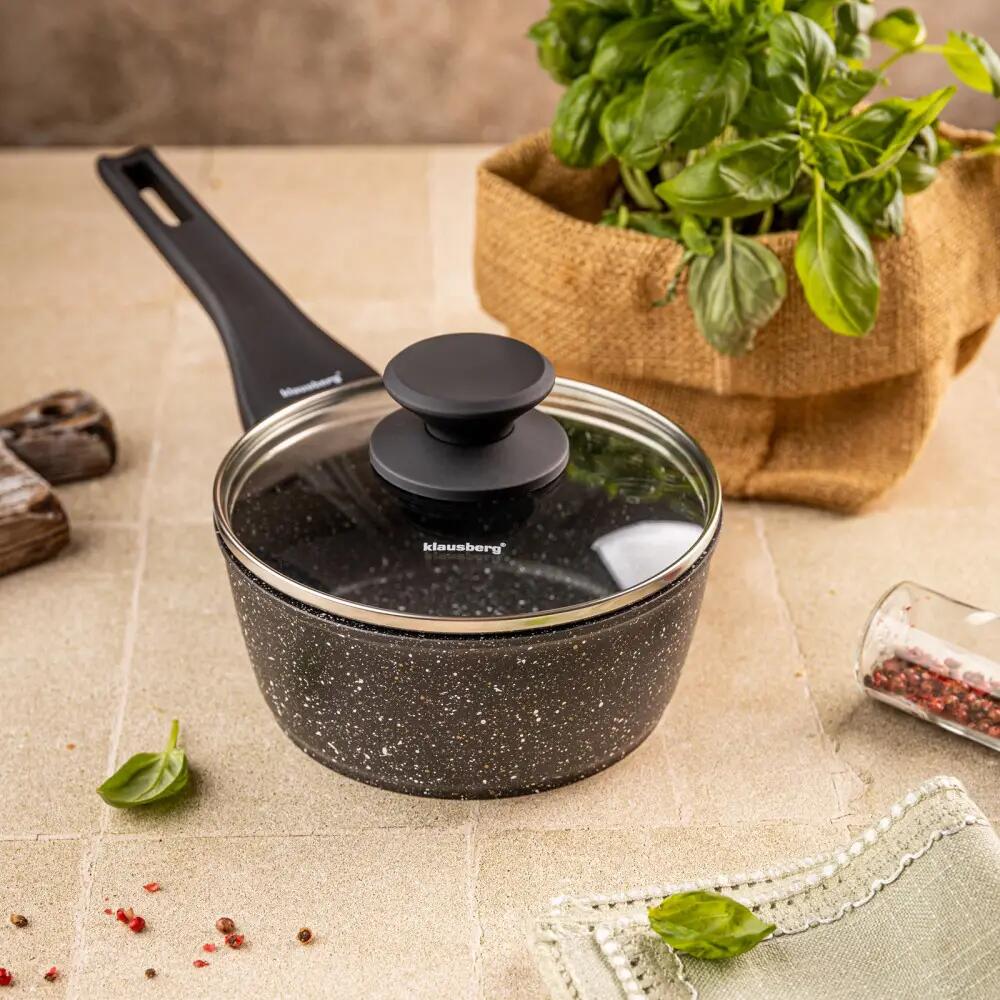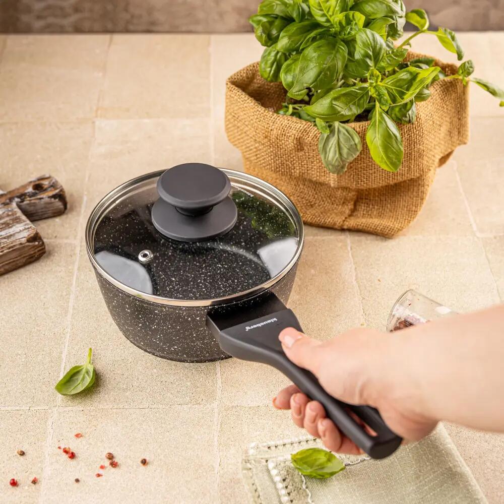 Învelișul său antiaderent din marmură previne lipirea alimentelor și o face ușor de curățat, în timp ce culoarea sa neagră elegantă, cu accente strălucitoare, adaugă o notă modernă oricărei bucătării. Mânerul lung și bine conturat asigură confort la amestecare și turnare.
