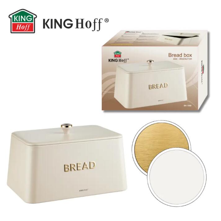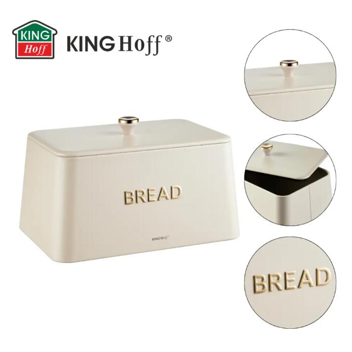 Eleganță și practicitate într-un singur accesoriu de bucătărie. Cutia de pâine KINGHoff KH-1950 este o combinație între designul minimalist și funcționalitatea de zi cu zi. Schema sa de culori bej și detaliile aurii îi conferă un caracter unic, în timp ce construcția robustă din metal și bambus garantează durabilitatea și depozitarea igienică a pâinii.