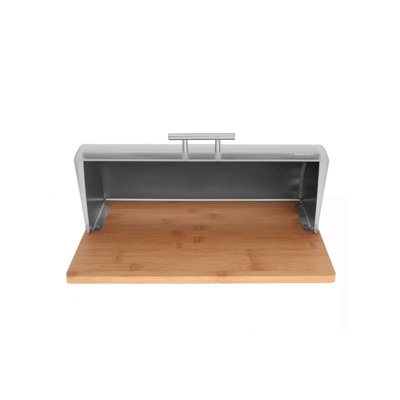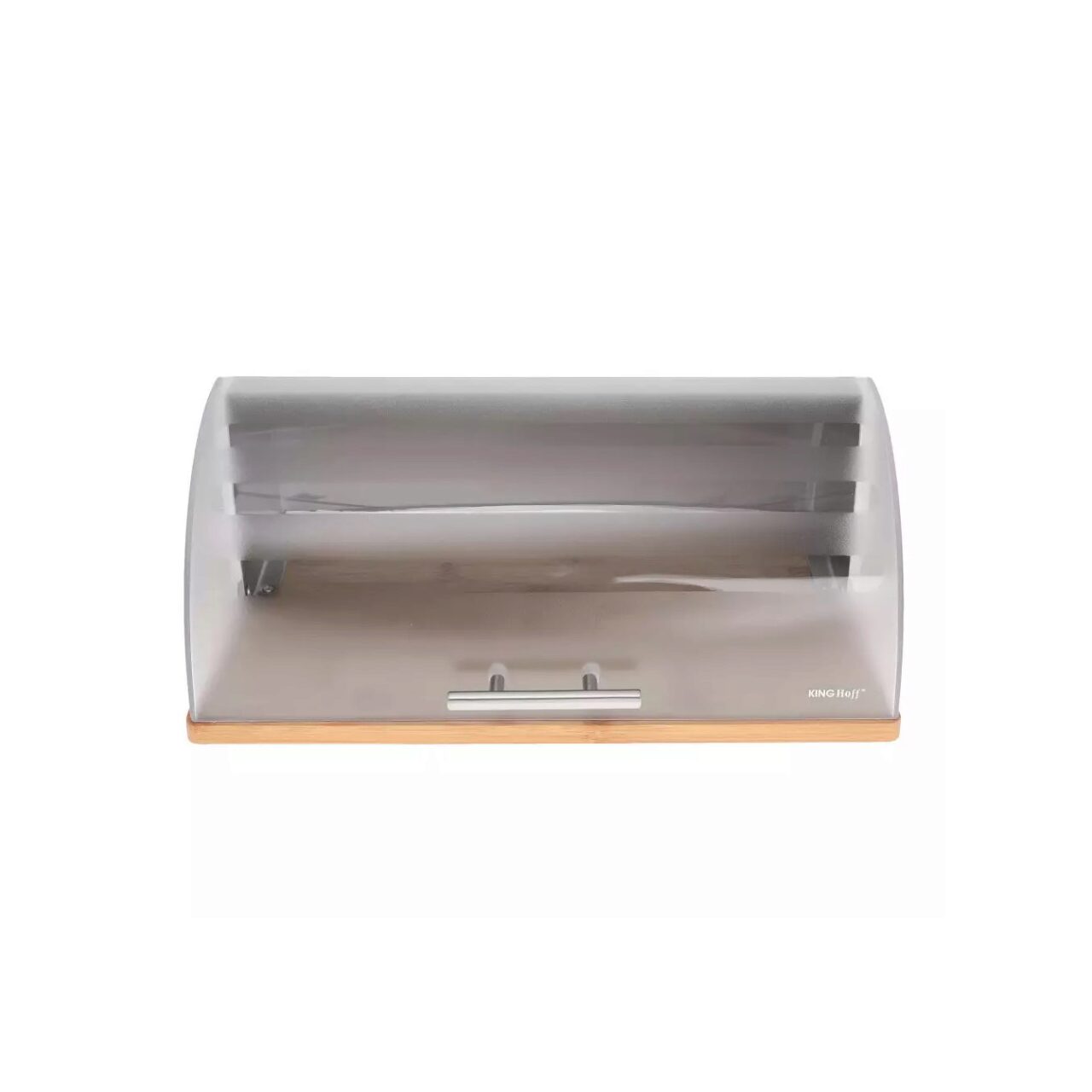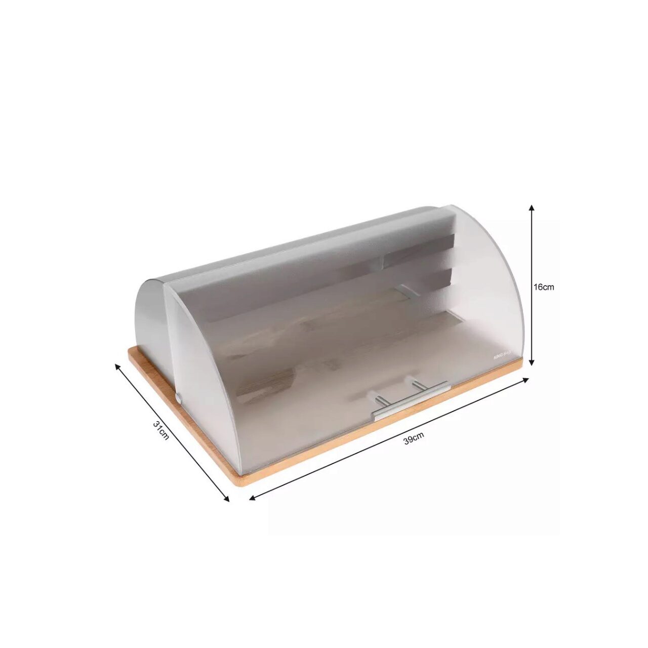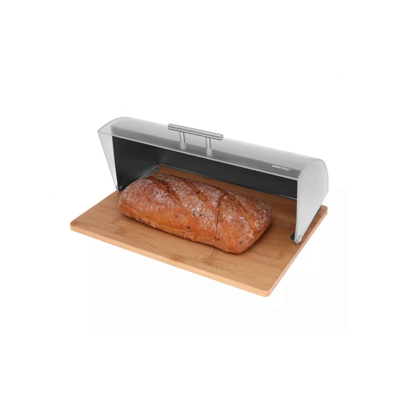 Recipient pentru pâine cu sticlă satinată, capac metalic și o scândură pe care poți tăia pâinea sau alte produse de copt.