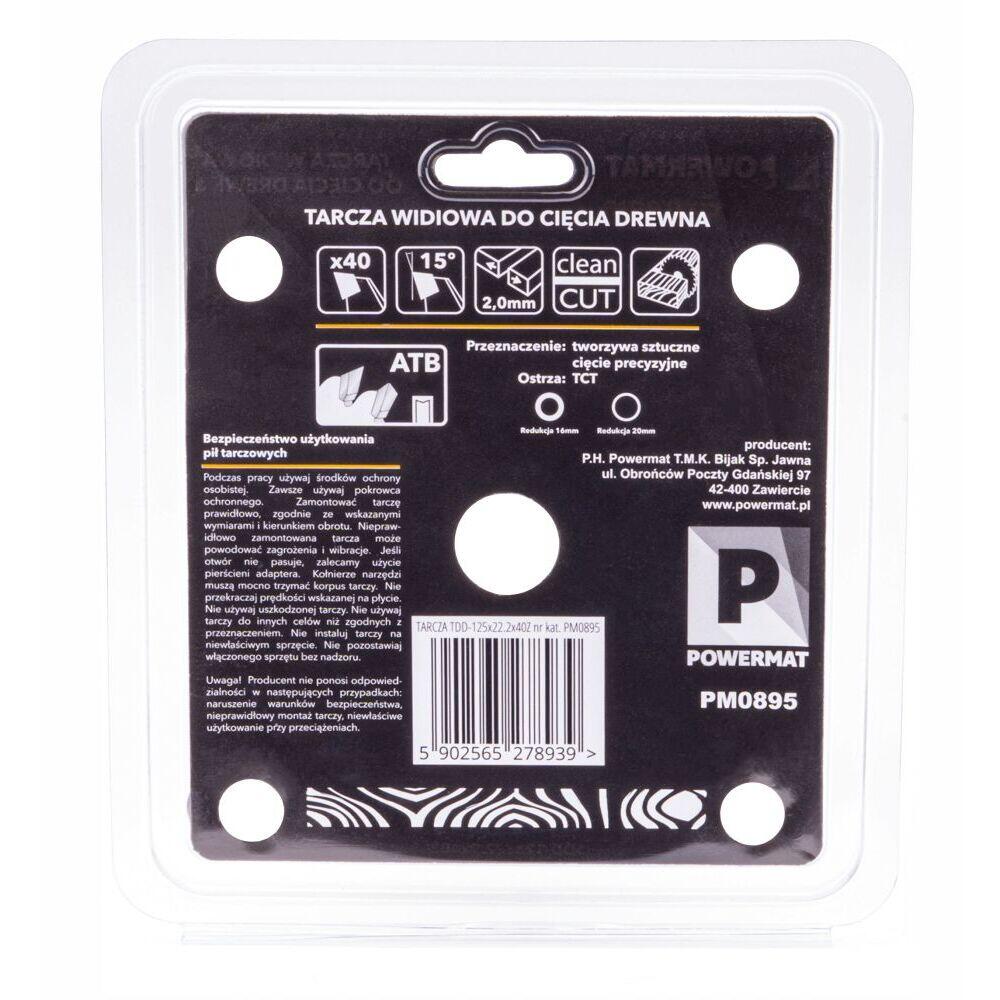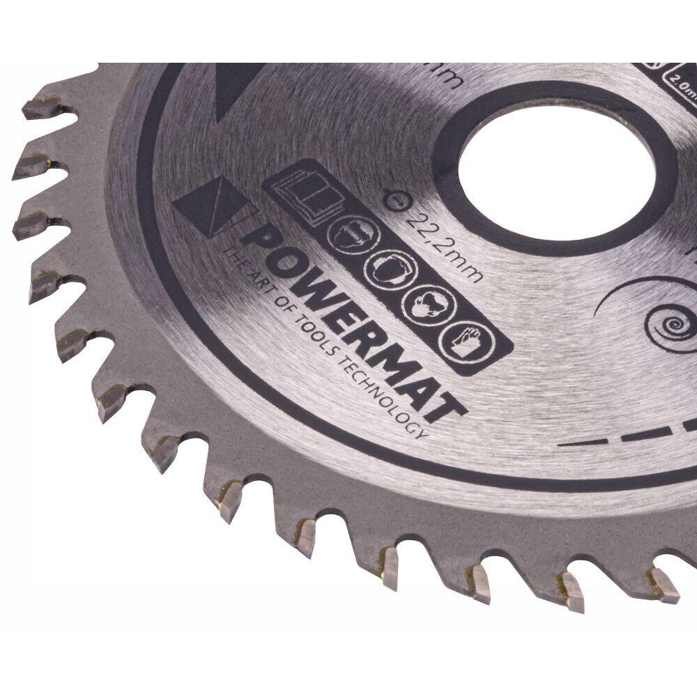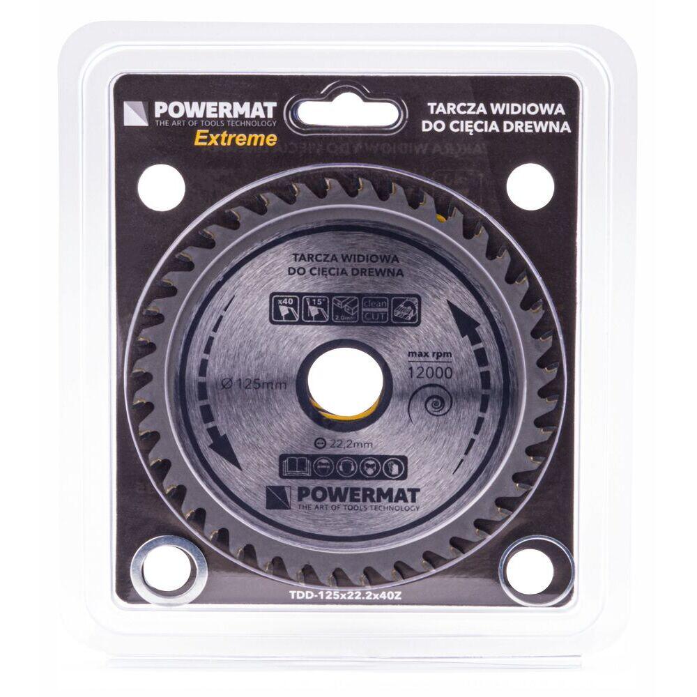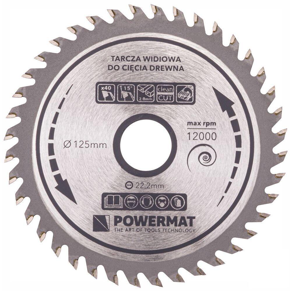 Lama durabila din otel calit cu 40 de dinti de taiat. Lamele sunt proiectate sa functioneze cu toate tipurile de fierastraie universale stationare si portabile. Lama Powermat este folosita pentru taierea lemnului moale, toate din lemn cum ar fi materiale, inclusiv placaj, placi, panouri, trunchiuri si ramuri precum si materiale moi. A fost adaptat la rotatii foarte rapide, ceea ce garanteaza taierea usoara si rapida cu ajutorul sau. Standard pentru fierastraie circulare de masa. Dimensiunea exterioara a discului este de 125 mm. Gaura de montare este de 22,2 mm.