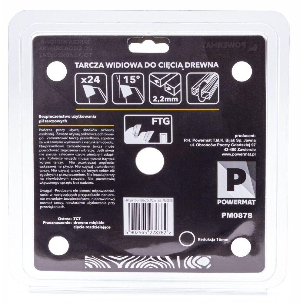 Lama durabila din otel calit cu 24 de dinti de taiat. Proiectat pentru a fi folosit cu fierastraie de masa circulare, fierastrau manual etc. Lama Powermat este folosita pentru taierea lemnului moale, toate materialele din lemn, inclusiv placaj, placi, panouri, trunchiuri si ramuri precum si materiale moi. A fost adaptat la rotatii foarte rapide, ceea ce garanteaza taierea usoara si rapida cu ajutorul sau. Standard pentru fierastraie circulare de masa. Dimensiunea exterioara a discului este de 160 mm. Gaura de montare este de 20 mm.