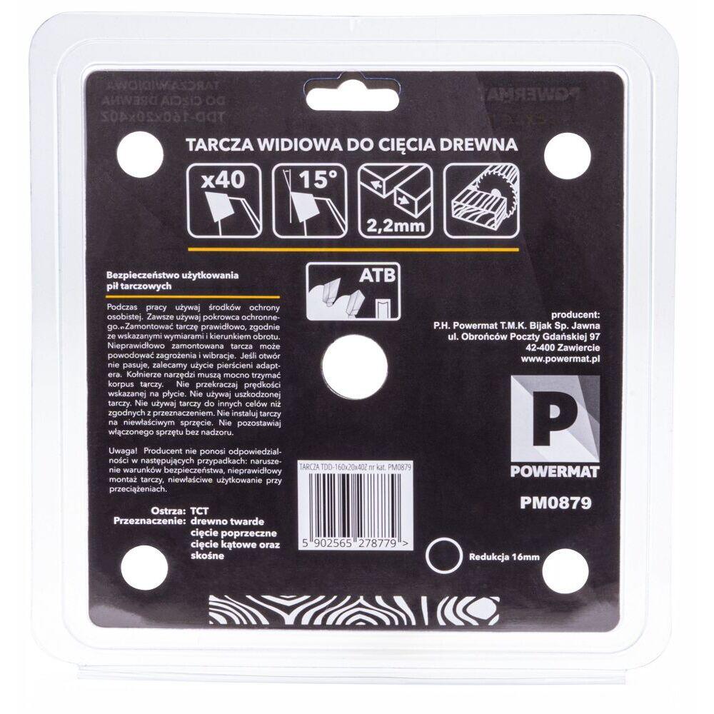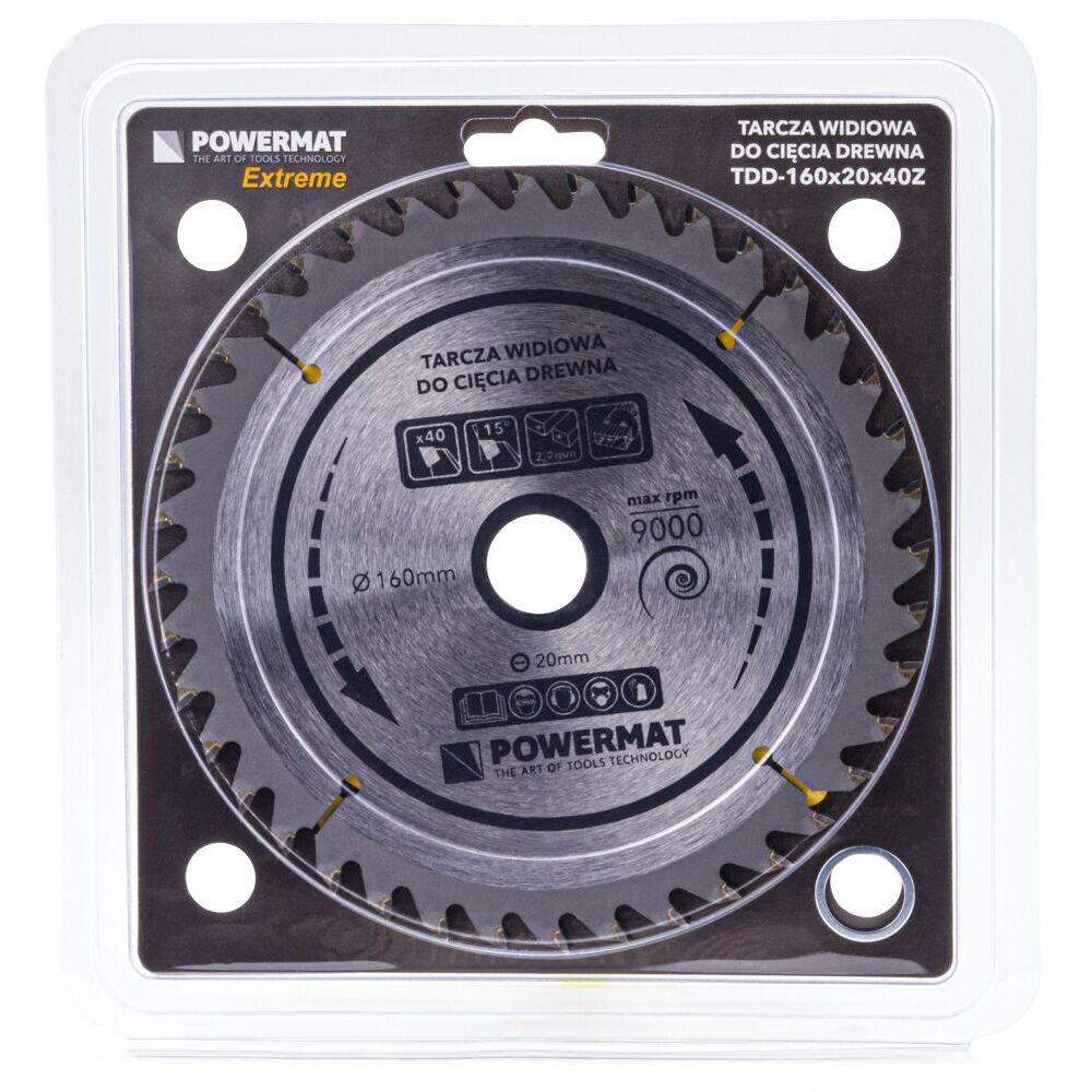 Lama durabila din otel calit cu 40 de dinti de taiat. Proiectat pentru a fi folosit cu fierastraie de masa circulare, fierastrau manual etc. Lama Powermat este folosita pentru taierea lemnului moale, toate materialele din lemn, inclusiv placaj, placi, panouri, trunchiuri si ramuri precum si materiale moi. A fost adaptat la rotatii foarte rapide, ceea ce garanteaza taierea usoara si rapida cu ajutorul sau. Standard pentru fierastraie circulare de masa. Dimensiunea exterioara a discului este de 160 mm. Gaura de montare este de 20 mm.