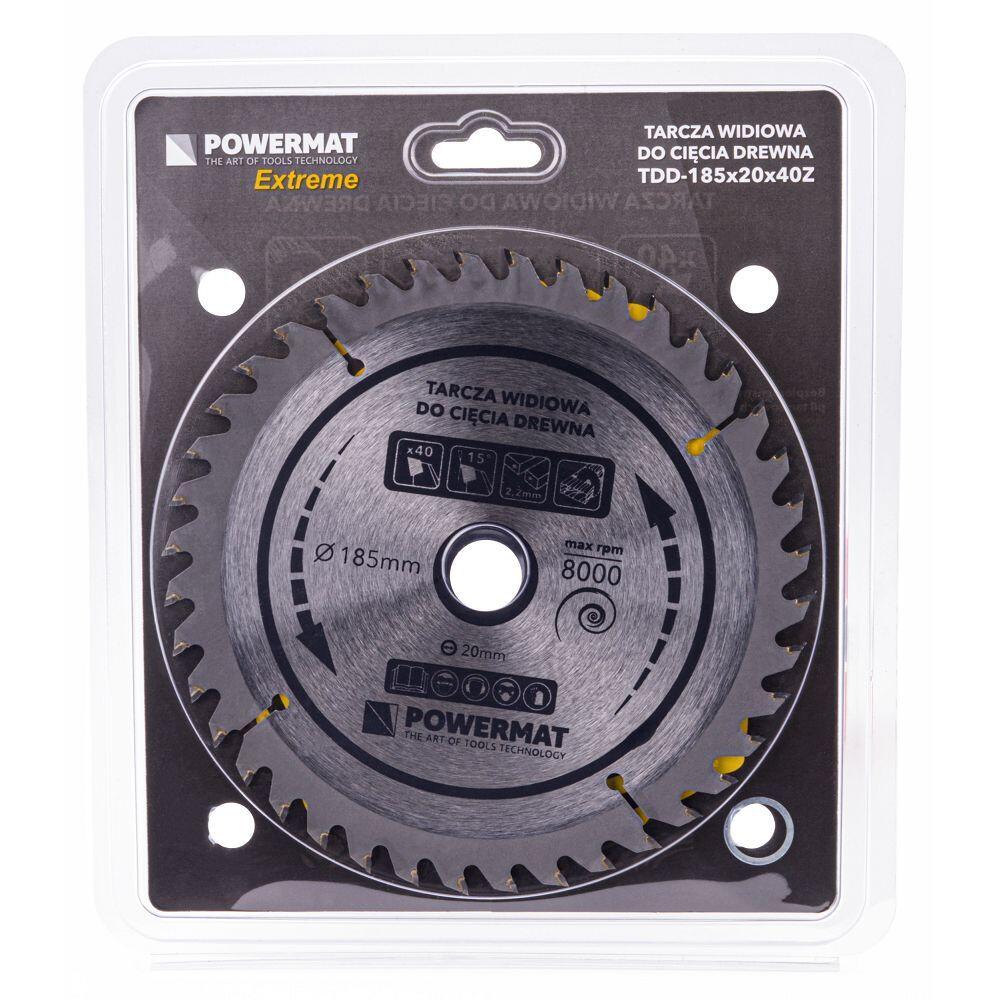 Lama durabila din otel calit cu 24 de dinti de taiat. Proiectat pentru a fi folosit cu fierastraie de masa circulare, fierastrau manual etc. Lama Powermat este folosita pentru taierea lemnului moale, toate materialele din lemn, inclusiv placaj, placi, panouri, trunchiuri si ramuri precum si materiale moi. A fost adaptat la rotatii foarte rapide, ceea ce garanteaza taierea usoara si rapida cu ajutorul sau. Standard pentru fierastraie circulare de masa. Dimensiunea exterioara a discului este de 185 mm. Gaura de montare este de 20 mm.