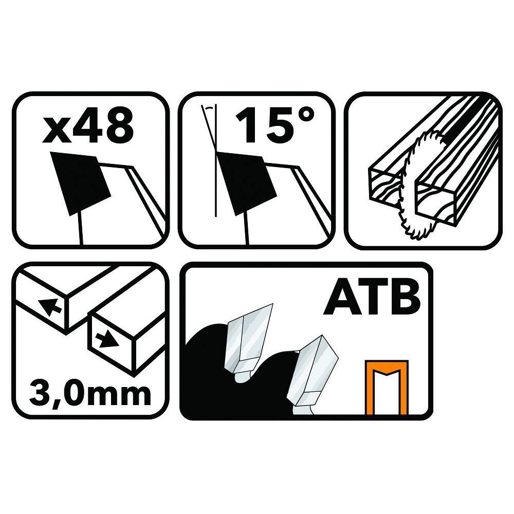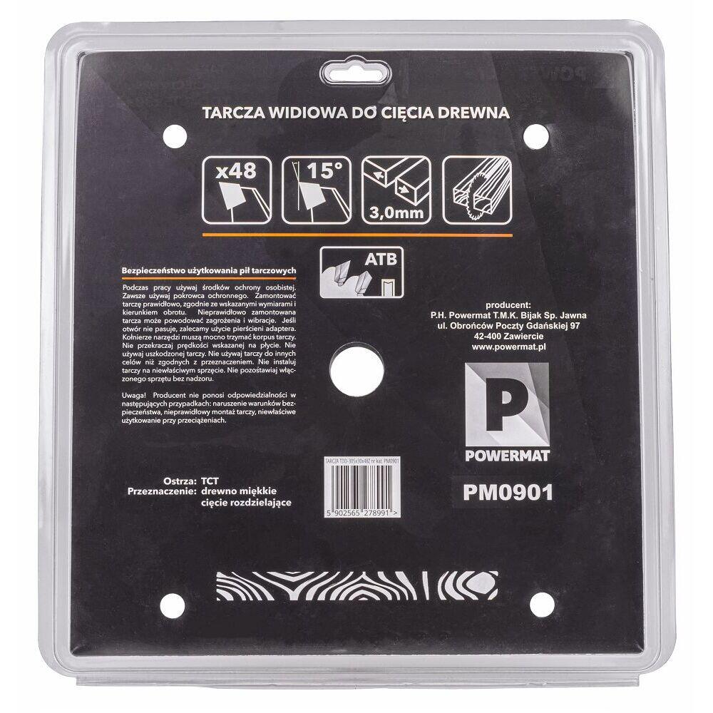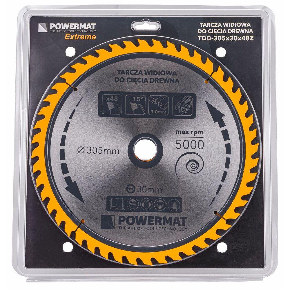 Lama de otel intarit, rezistent are 48 de dinti de taiere. Destinat utilizarii cu fierastraie de masa circulare si fierastraie cu unghi. Lama Powermat este folosit pentru lemn taiat, toate din lemn cum ar fi materiale, inclusiv placaj, placi, panouri, trunchiuri si ramuri, si materiale moi. A fost adaptat la rotatii foarte rapide, ceea ce garanteaza taierea usoara si rapida cu ajutorul sau. Are un standard pentru fierastraie circulare de masa si unghiulare. Dimensiunea exterioara a discului este de 305 mm. Gaura de montare este de 30 mm.
