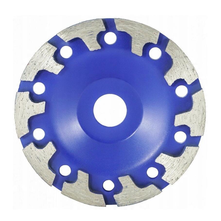 Disc diamantat în formă de T pentru șlefuirea materialelor de construcție dure. Prezintă o concentrație excepțional de mare de diamante de înaltă calitate. Discul asigură o șlefuire de înaltă calitate pe întreaga sa durată de viață. Aceste caracteristici îmbunătățesc calitatea șlefuirii și durata de viață a discului. Utilizarea orificiilor de răcire prelungește semnificativ durata de viață a discului. Procedurile moderne de tratament termic și un finisaj special al suprafeței reduc uzura discului și îmbunătățesc durabilitatea. Setul include un inel O pentru a reduce diametrul interior. Acest disc este ideal pentru îndepărtarea neregularităților, modelarea și șlefuirea suprafețelor mari: granit, marmură, cărămidă, clincher, piatră naturală și artificială, beton armat și pavele. Conceput pentru utilizare uscată.
