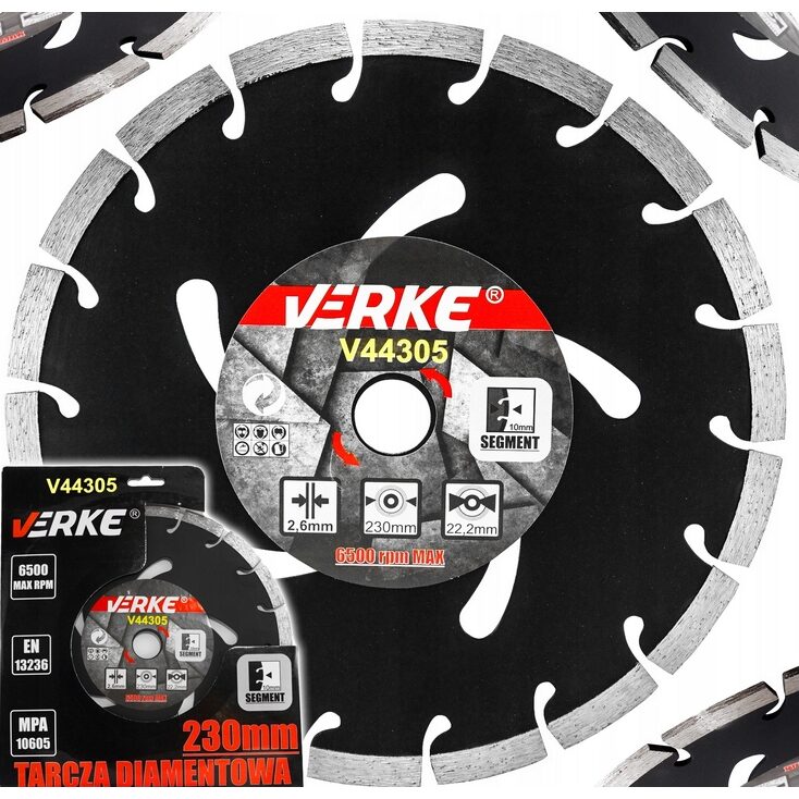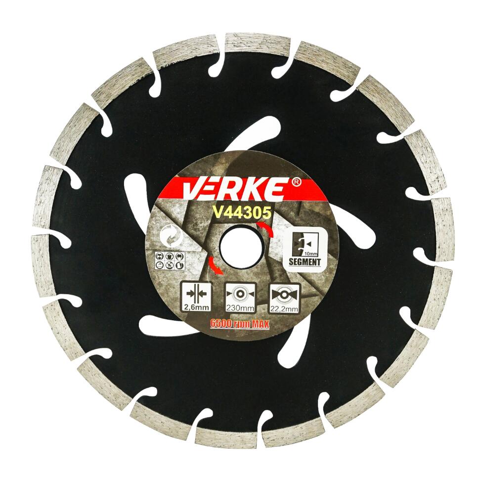 Această lamă diamantată segmentată profesională de la VERKE este concepută pentru tăierea materialelor de construcții dure. Forma specială a marginii lamei diamantate garantează viteze de tăiere mai mari în cele mai dure materiale, fără a compromite calitatea finisajului. Setul include un inel O pentru a reduce diametrul interior. Concepută pentru utilizare uscată cu polizoare unghiulare, poate fi utilizată pentru tăierea betonului, cărămizii, clincherului și pavajelor. Lama este prevăzută cu o lamă segmentată care facilitează îndepărtarea resturilor și permite lucrul ușor pe suprafețe dure. Setul include un inel O pentru a reduce diametrul interior. Lamele VERKE sunt cea mai bună alegere pentru cele mai solicitante lucrări. Această lamă este potrivită atât pentru tăiere uscată, cât și pentru tăiere umedă.