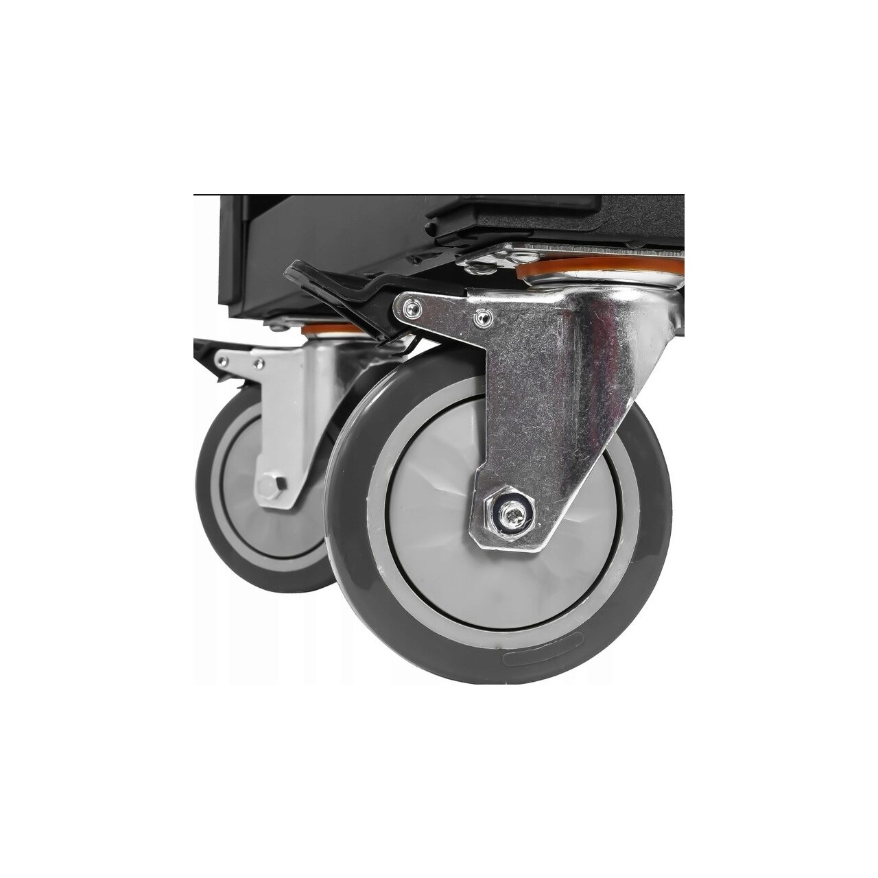 2 roți fixe și 2 roți pivotante cu diametrul de 125 mm echipate cu frână