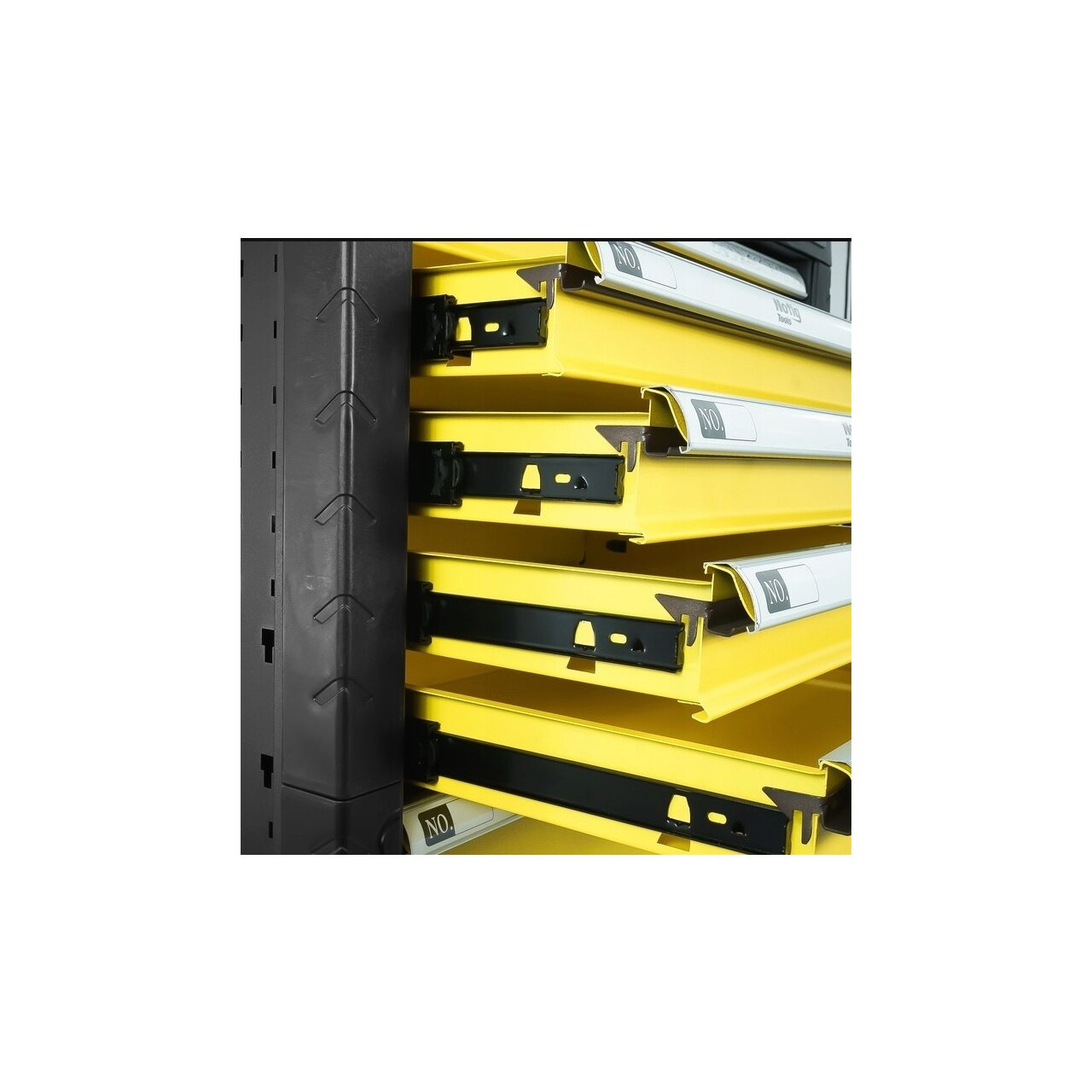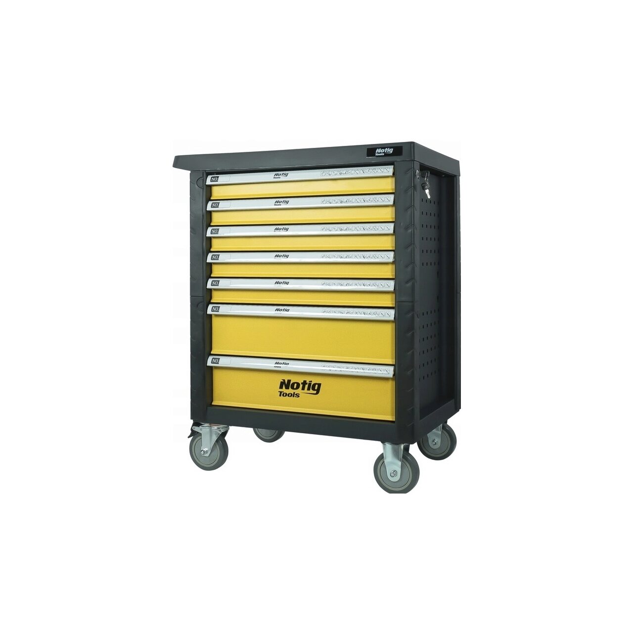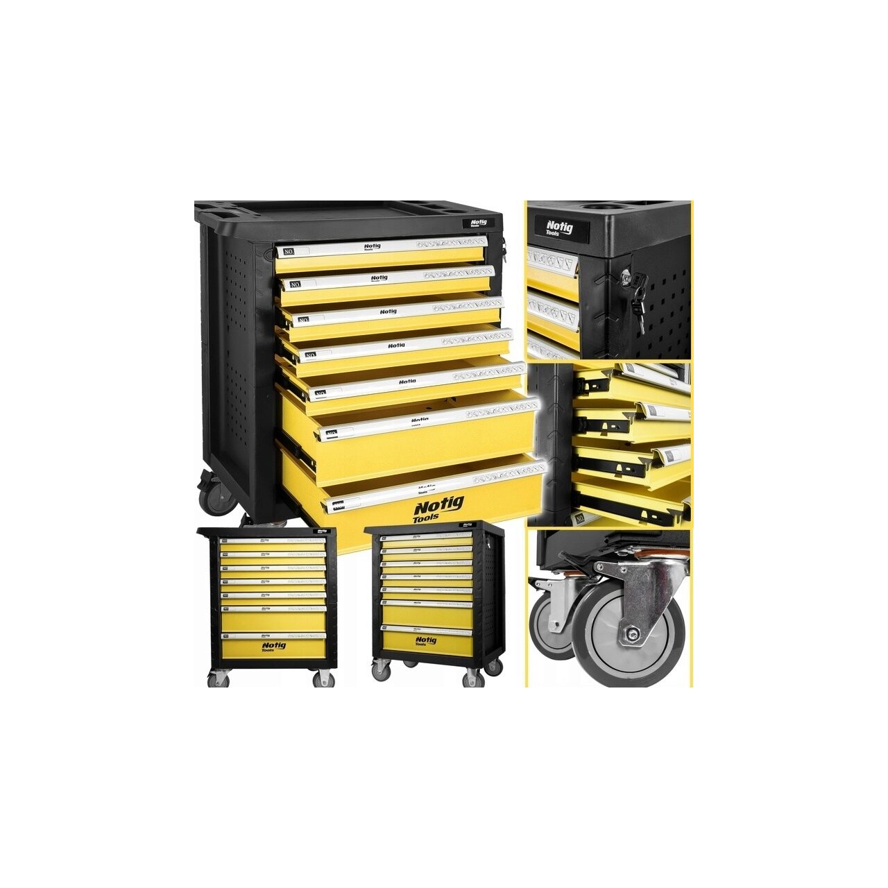 Notig Tools Dulapul pentru scule are 7 sertare practice pentru scule, închise cu un sistem de blocare centrală . Toate sertarele sunt complet deschizabile, au ghidaje cu bile metalice , asigurând o funcționare pe termen lung, lină și fiabilă. Sertarele sunt fixate cu o încuietoare cu clichet care protejează mediul în timpul transportului. Suprafața blatului este rezistentă la ulei și grăsimi. Roți pivotante , liniștite, de cinci inci facilitează manevrarea dulapului, acestea sunt echipate suplimentar cu o frână. Dulapul este echipat cu un mâner care facilitează transportul. Vă permite să păstrați ordinea la locul de muncă. Datorită sertarelor închise cu o cheie, protejează instrumentele împotriva furtului.