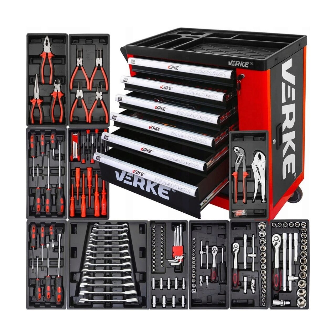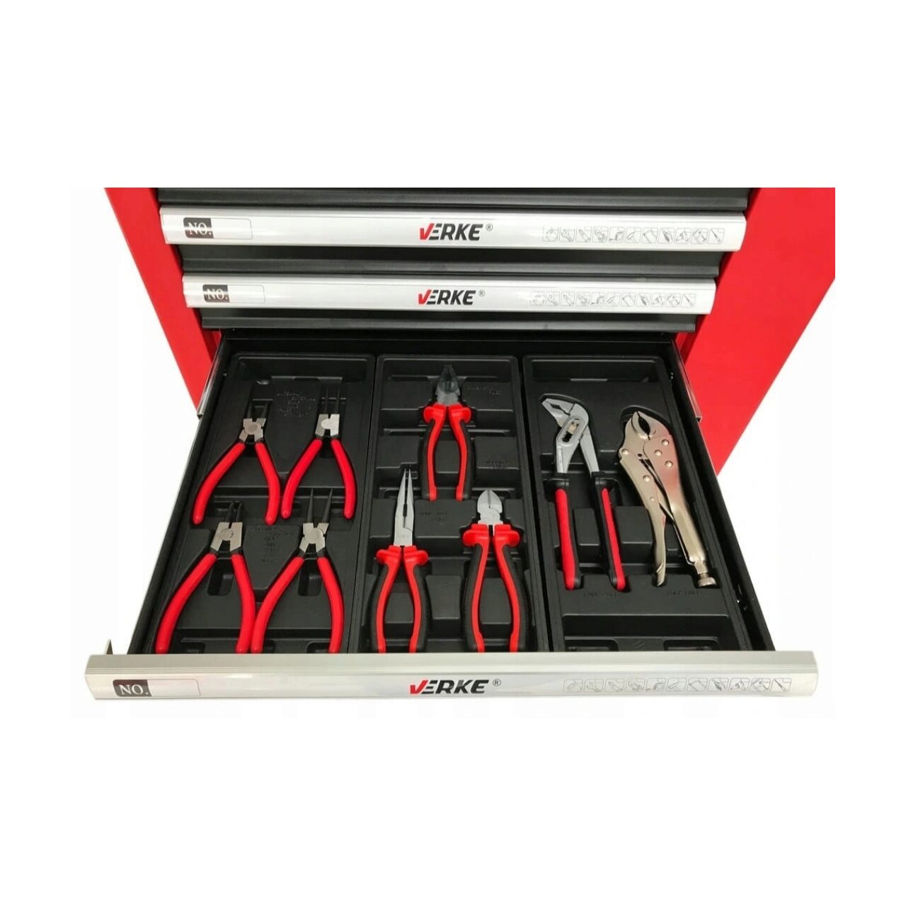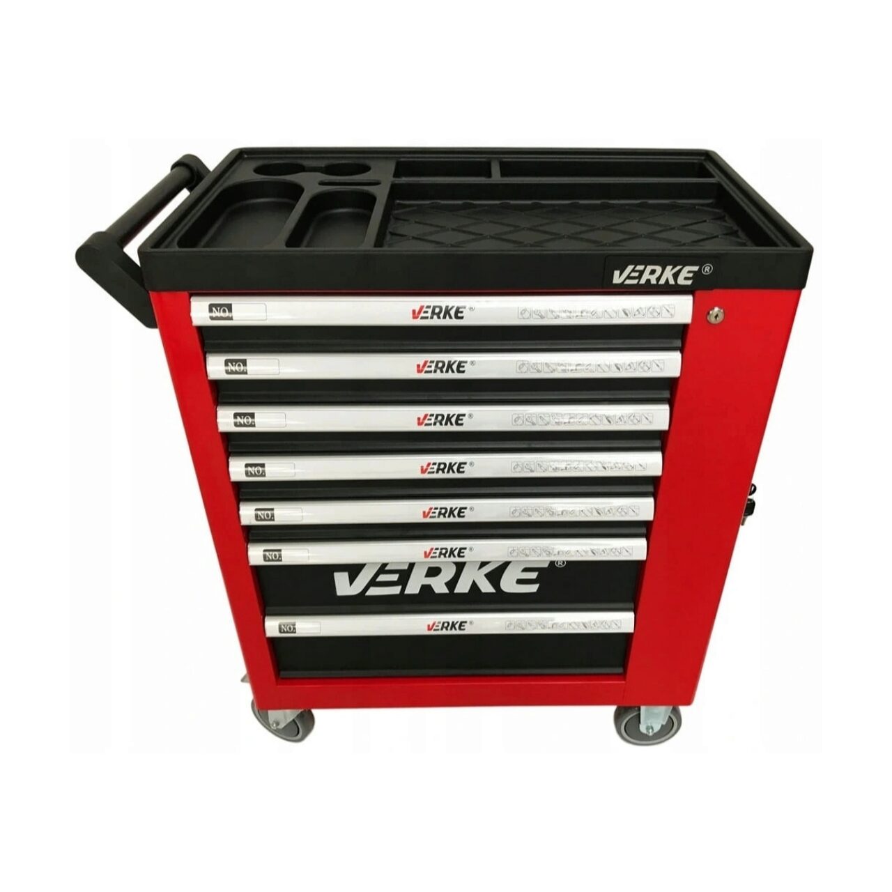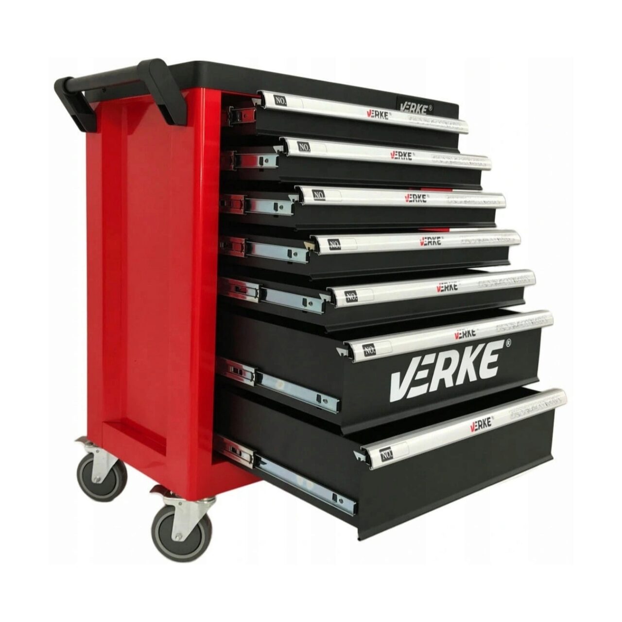 Dulapul pentru scule Verke are 7 sertare practice pentru unelte plus un dulap lateral inchis cu incuietoare centrala. Toate sertarele sunt complet deschise, au ghidaje cu bile, asigurând o funcționare pe termen lung, lină și fiabilă. Sertarele sunt asigurate cu un blocaj cu clichet care protejează mediul în timpul transportului. Suprafața blatului este rezistentă la ulei și grăsime. Roțile pivotante de cinci inci, silențioase, facilitează manevrarea dulapului și sunt echipate suplimentar cu o frână. Dulapul este echipat cu un maner care il face usor de transportat.
