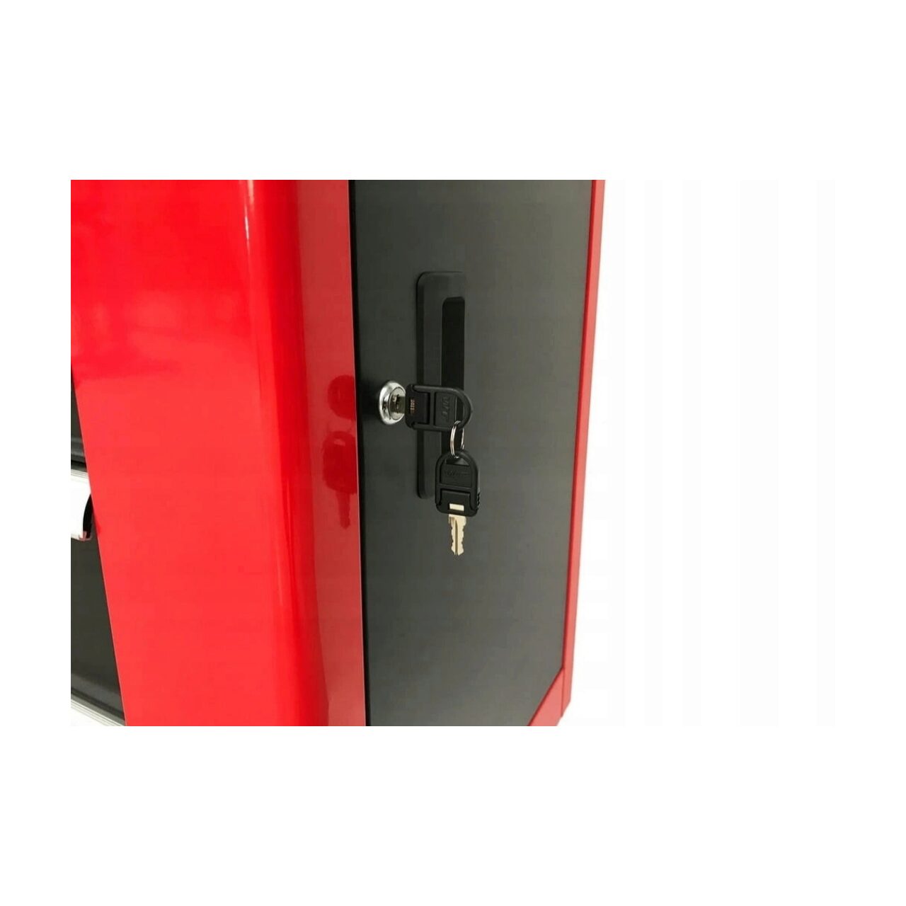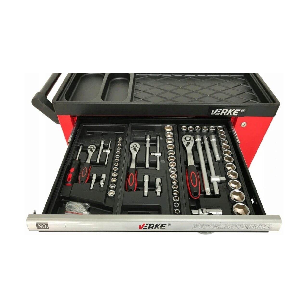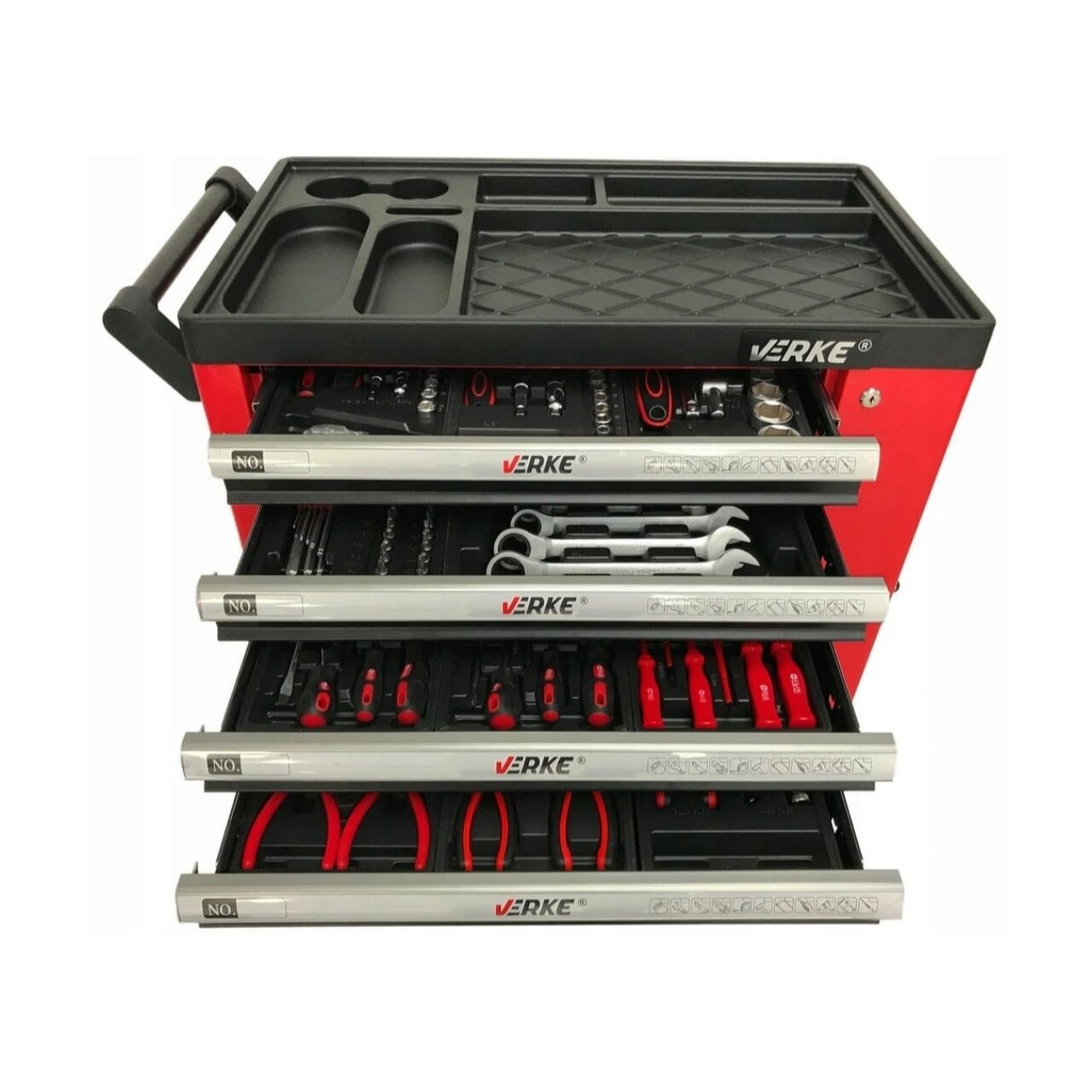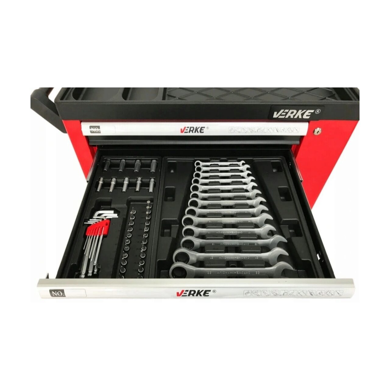 Dulapul pentru scule Verke are 7 sertare practice pentru unelte plus un dulap lateral inchis cu incuietoare centrala. Toate sertarele sunt complet deschise, au ghidaje cu bile, asigurând o funcționare pe termen lung, lină și fiabilă. Sertarele sunt asigurate cu un blocaj cu clichet care protejează mediul în timpul transportului. Suprafața blatului este rezistentă la ulei și grăsime. Roțile pivotante de cinci inci, silențioase, facilitează manevrarea dulapului și sunt echipate suplimentar cu o frână. Dulapul este echipat cu un maner care il face usor de transportat.