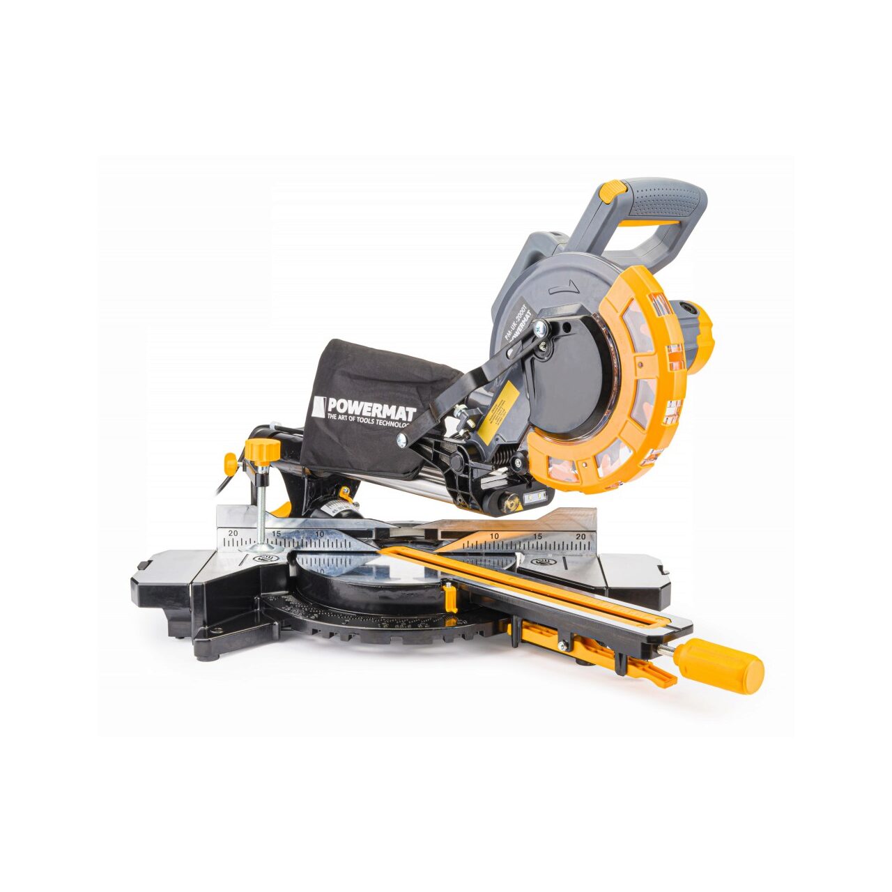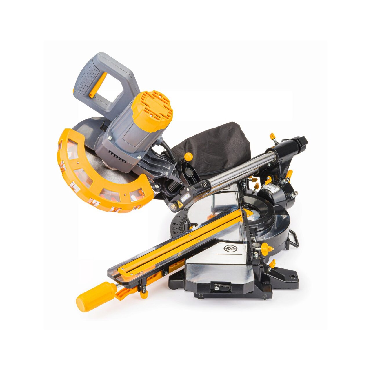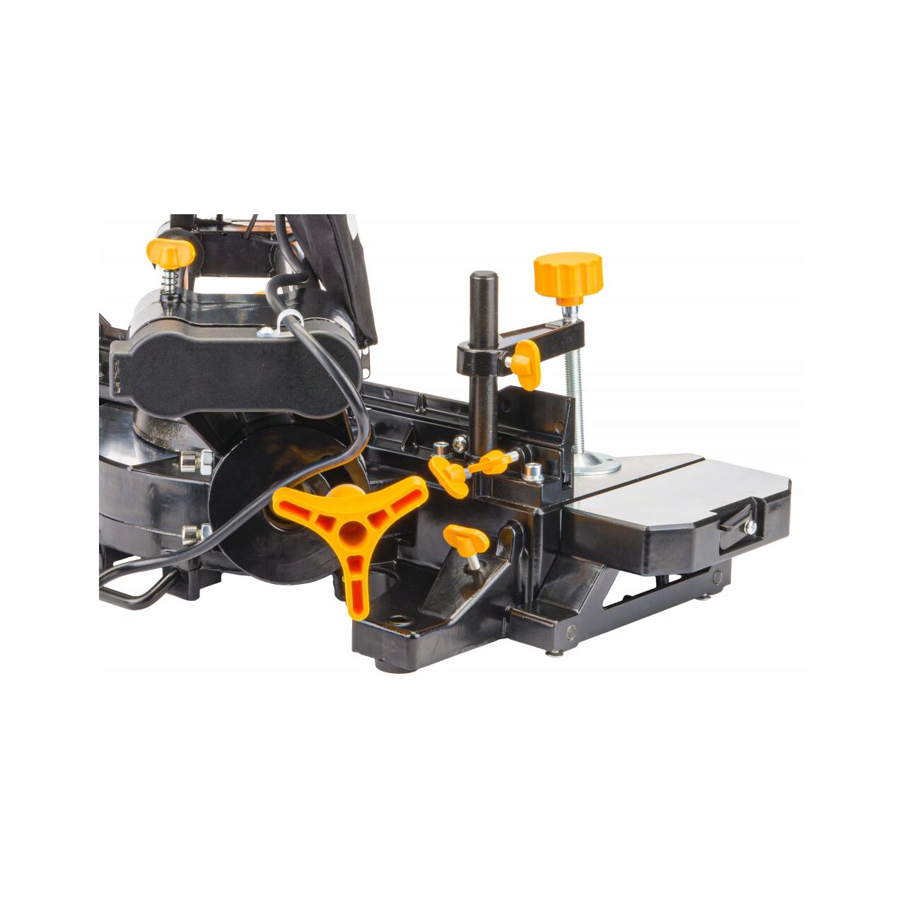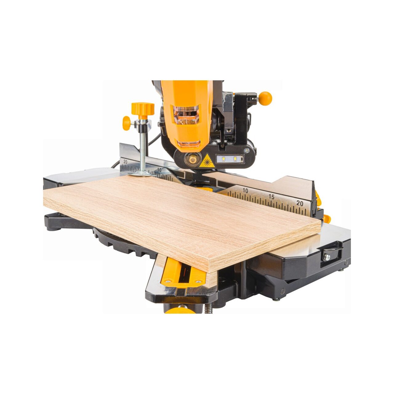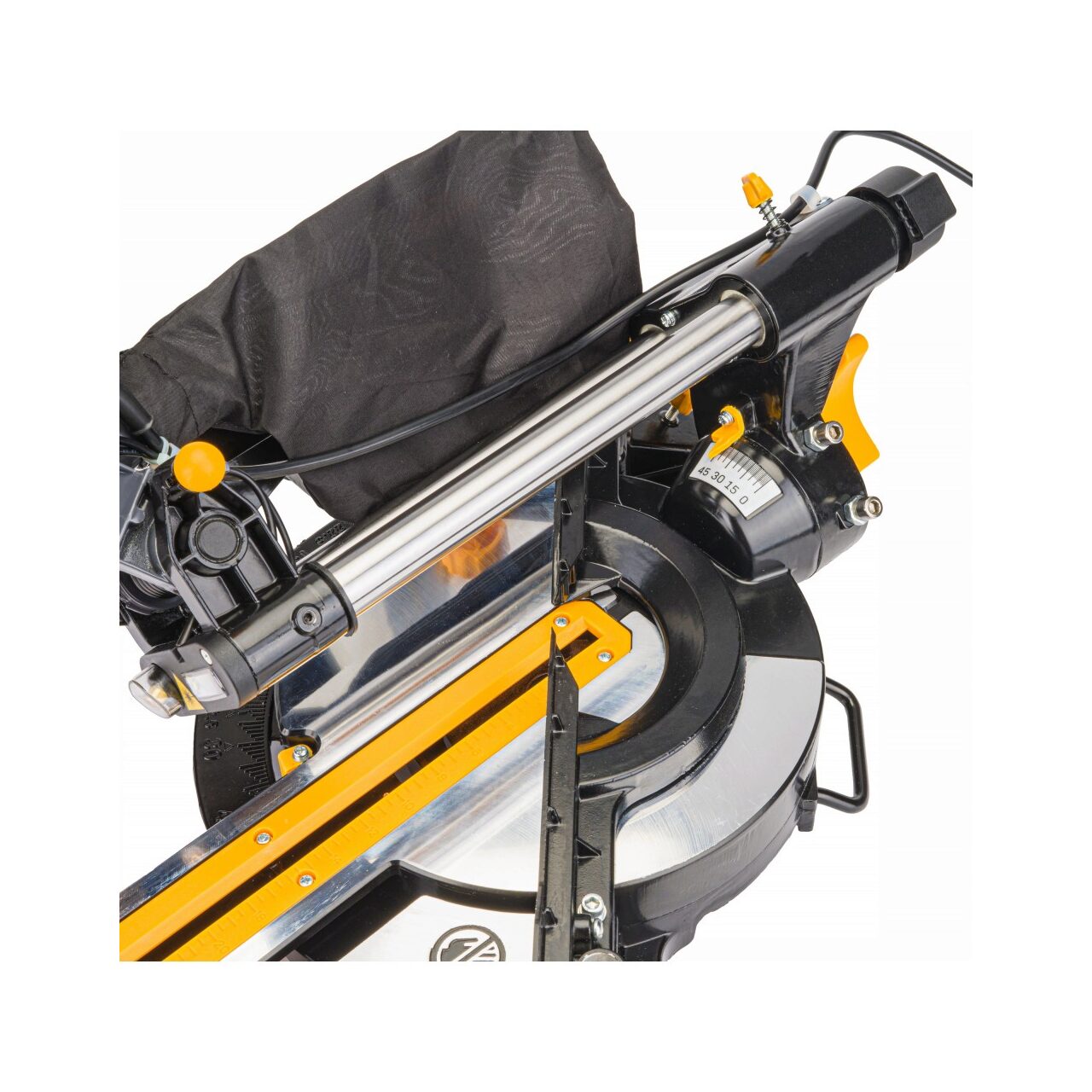 Masă rotativă cu setarea unghiului și disc de înclinare cu un domeniu de reglare de 0 - 45 de grade. Un ghid și un menghin pentru lucrări sigure și curate în lemn, precum și aluminiu și materiale plastice cu utilizarea unui disc dedicat.