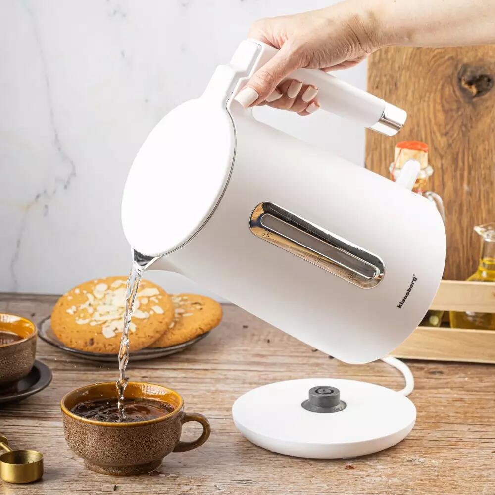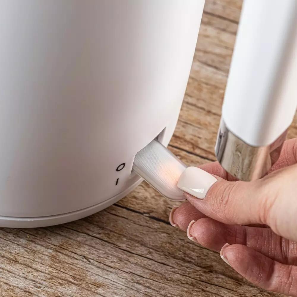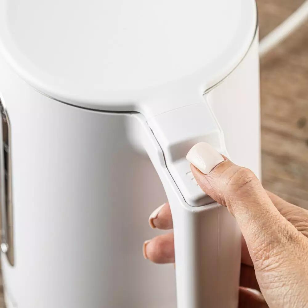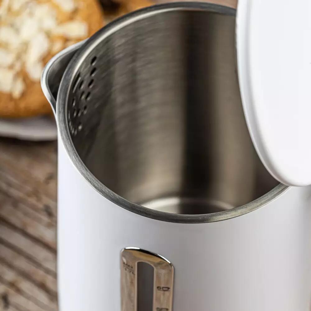 Este un fierbător modern cu un finisaj alb clasic și detalii argintii elegante.