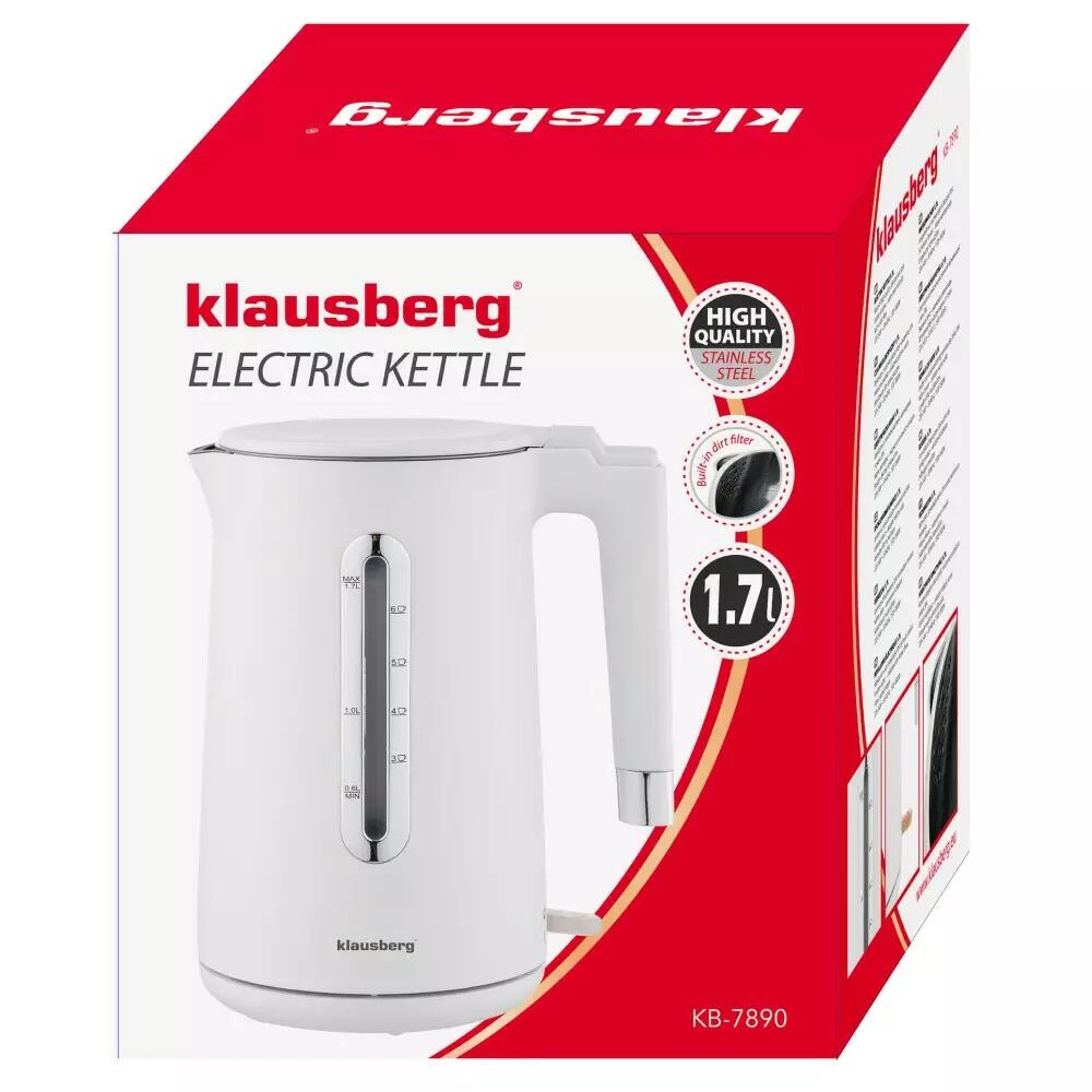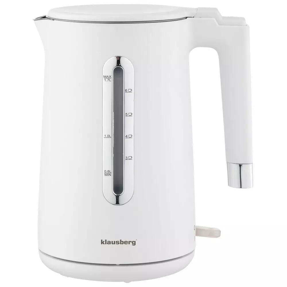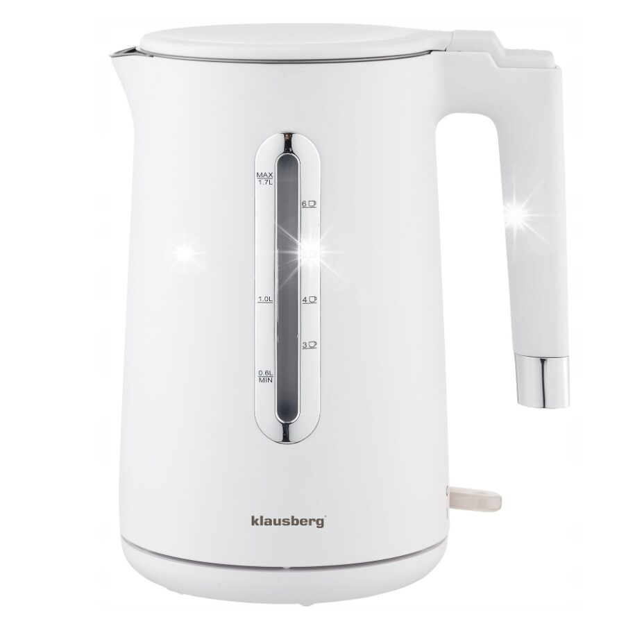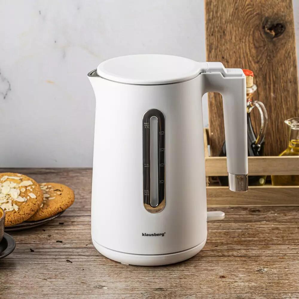 Este un fierbător modern cu un finisaj alb clasic și detalii argintii elegante.