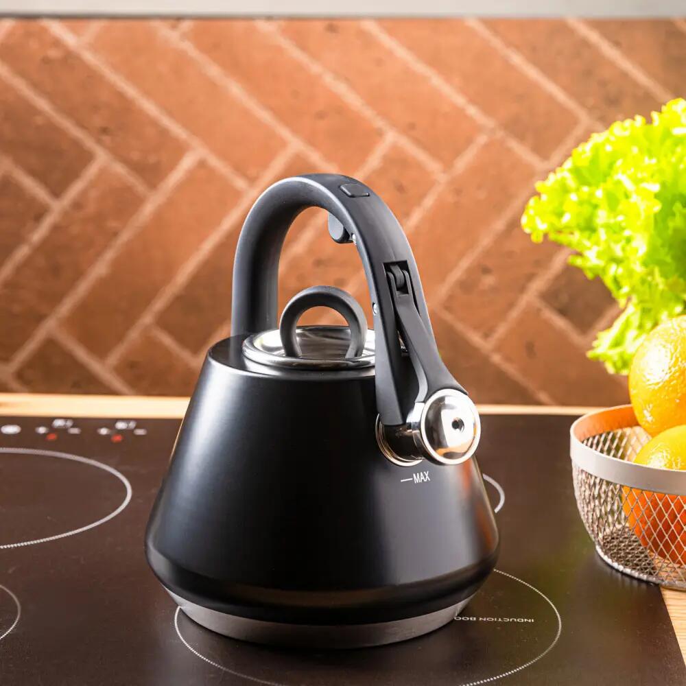 Cu o capacitate de 2,5 litri, fierbătorul este ideal pentru uz casnic, la birou și în catering, iar fluierul clasic vă informează eficient că apa fierbe.
