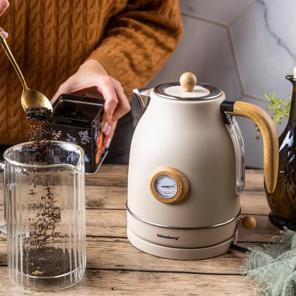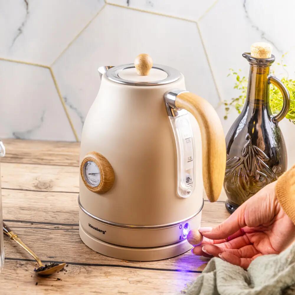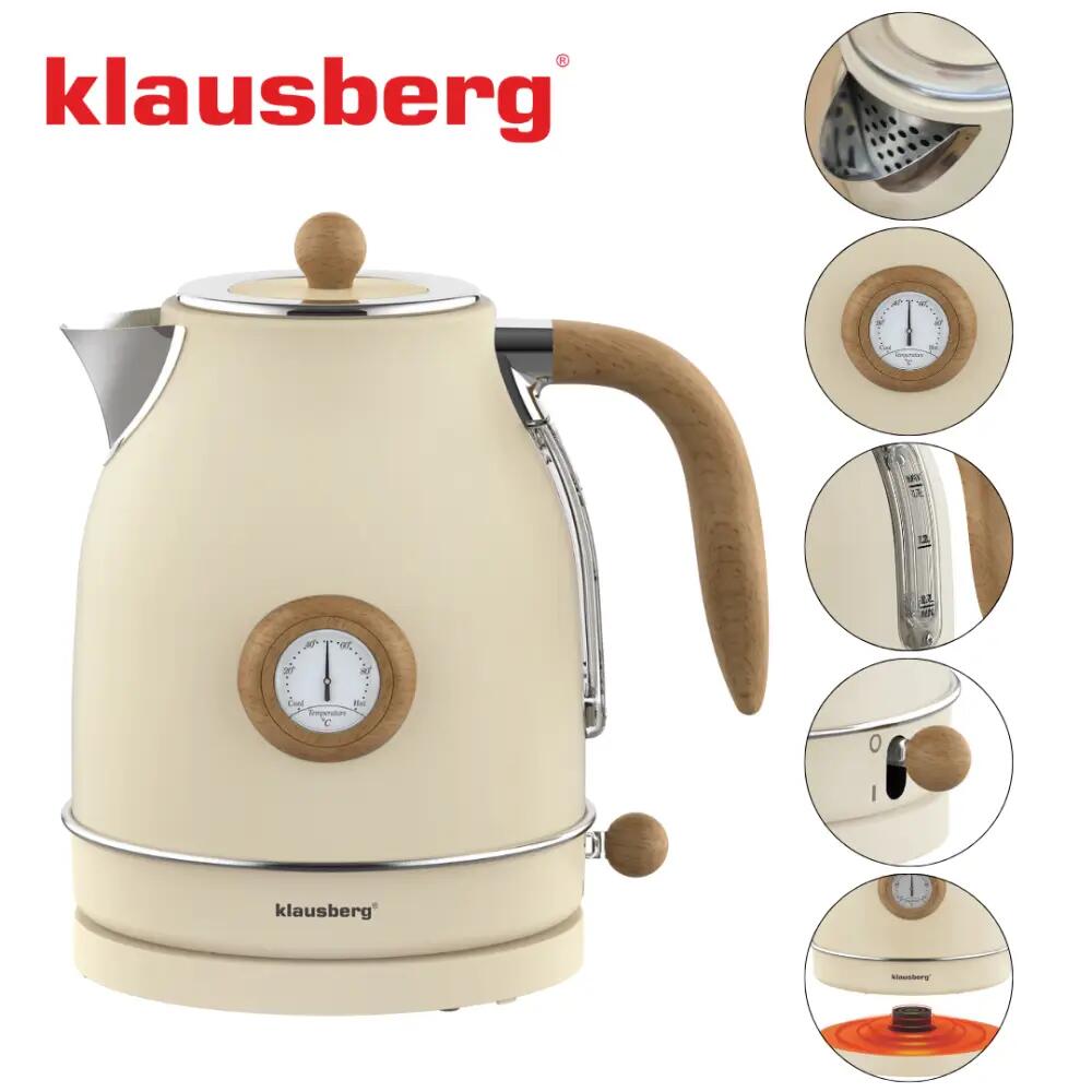 Klausberg KB-9006 este un fierbător electric care combină fierberea rapidă a apei cu un aspect retro unic. Carcasa de culoare crem cu detalii din imitație de lemn și termometrul analog îi conferă un caracter elegant care se potrivește bine cu bucătăriile moderne, clasice, scandinave și vintage. Cu o capacitate de 1,7 litri, se va potrivi bine într-o casă, birou, cafenea sau chicinetă de hotel.