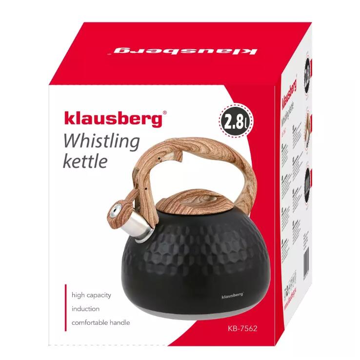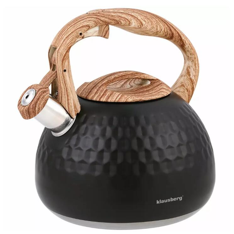 Un ceainic din oțel cu fluier din inox de înaltă calitate vopsit în negru mat.