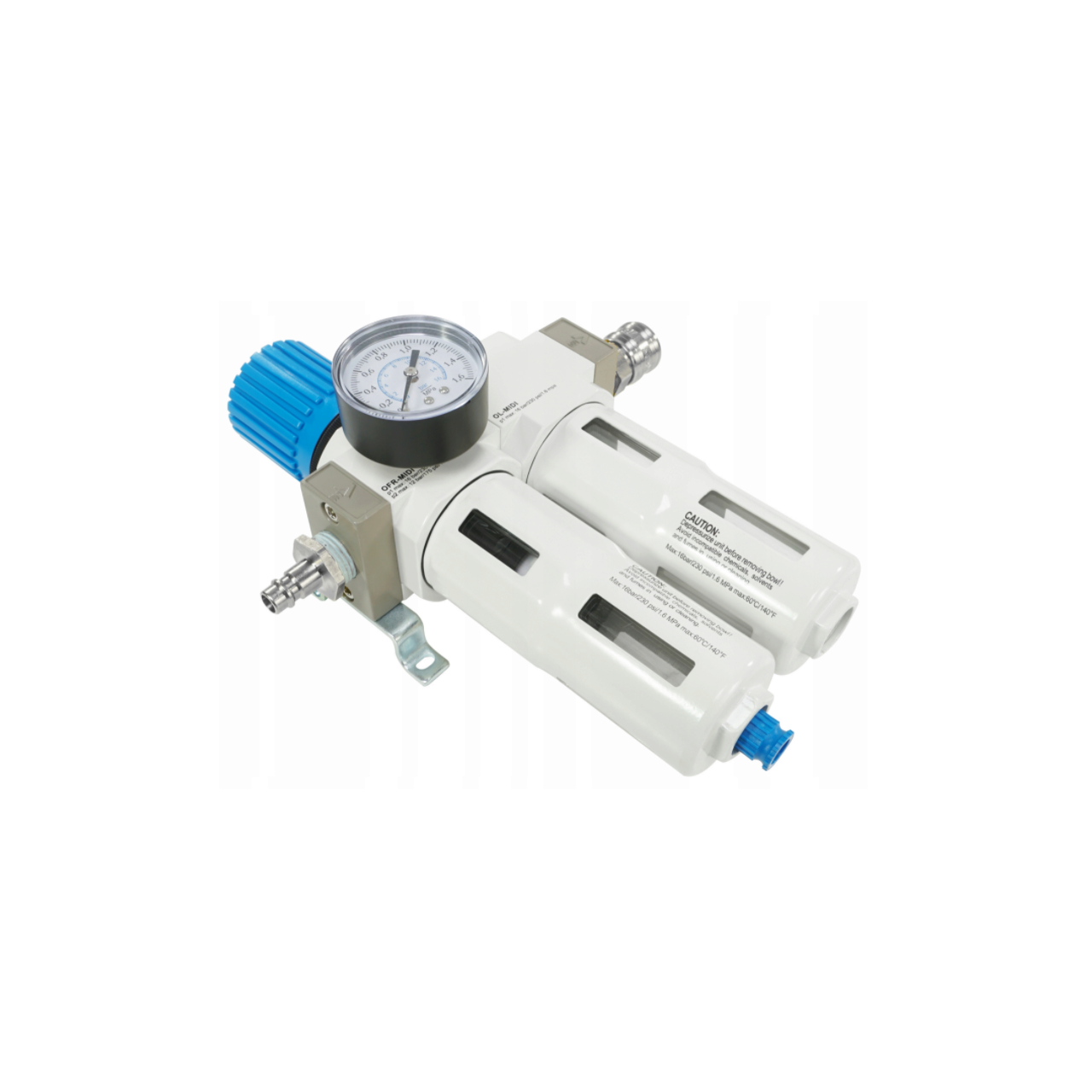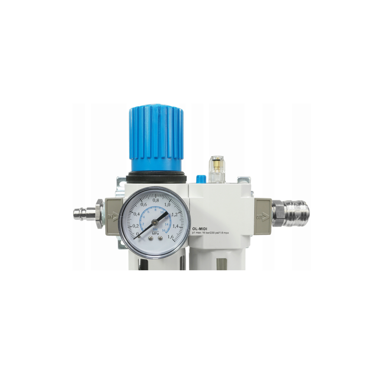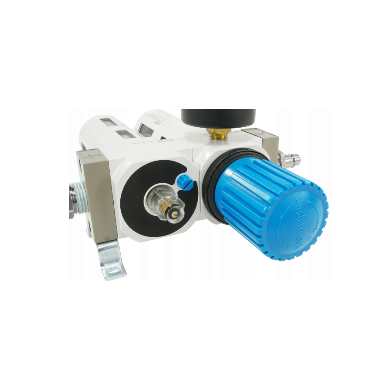 Un buton convenabil de pe reductorul filtrului este folosit pentru a seta presiunea. Butonul are un blocaj care protejează împotriva schimbării neintenționate a setării - înainte de reglare, trebuie deblocat trăgându-l în sus. Domeniul de măsurare al manometrului este 0 - 16 bar. Cadranul este gradat în bare cu o gradare cu o precizie de 0,2 bar. Manometrul poate fi instalat în portul de pe carcasa reductorului filtrului - puteți alege între două conexiuni: față sau spate. Conectați portul nefolosit cu ștecherul furnizat. Setul vine cu un suport de montare spate cu șuruburi. Setul include o cuplare rapidă și o mufă.