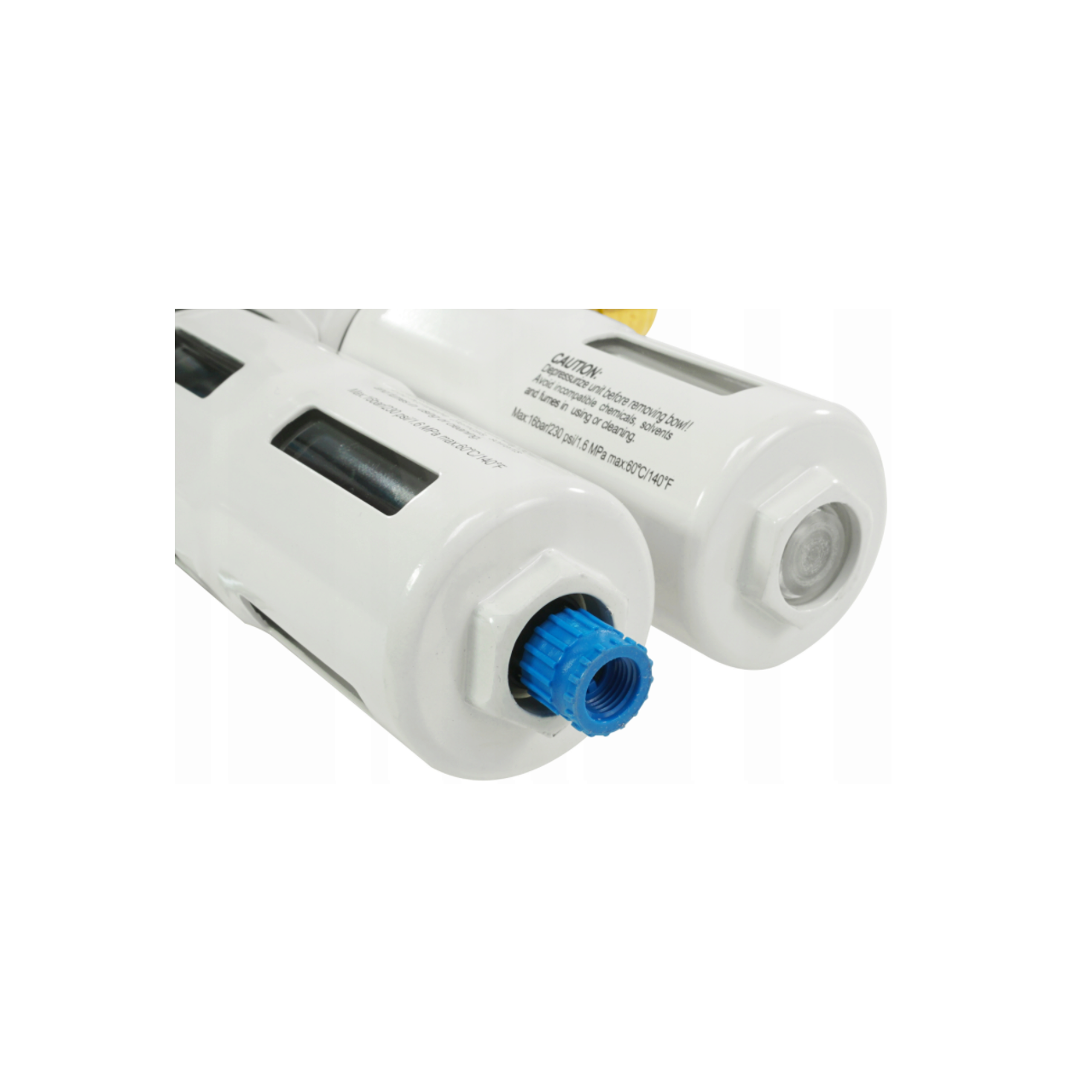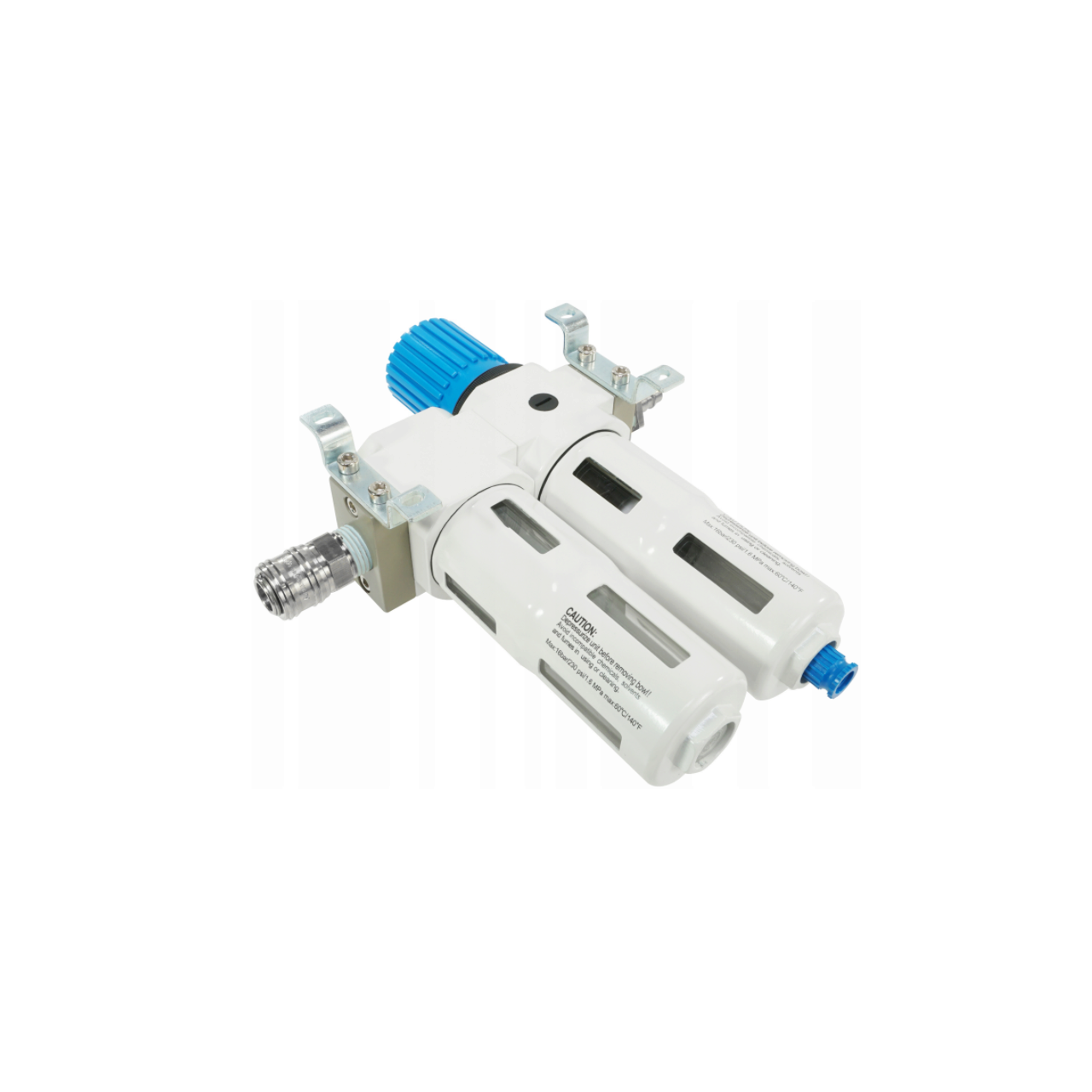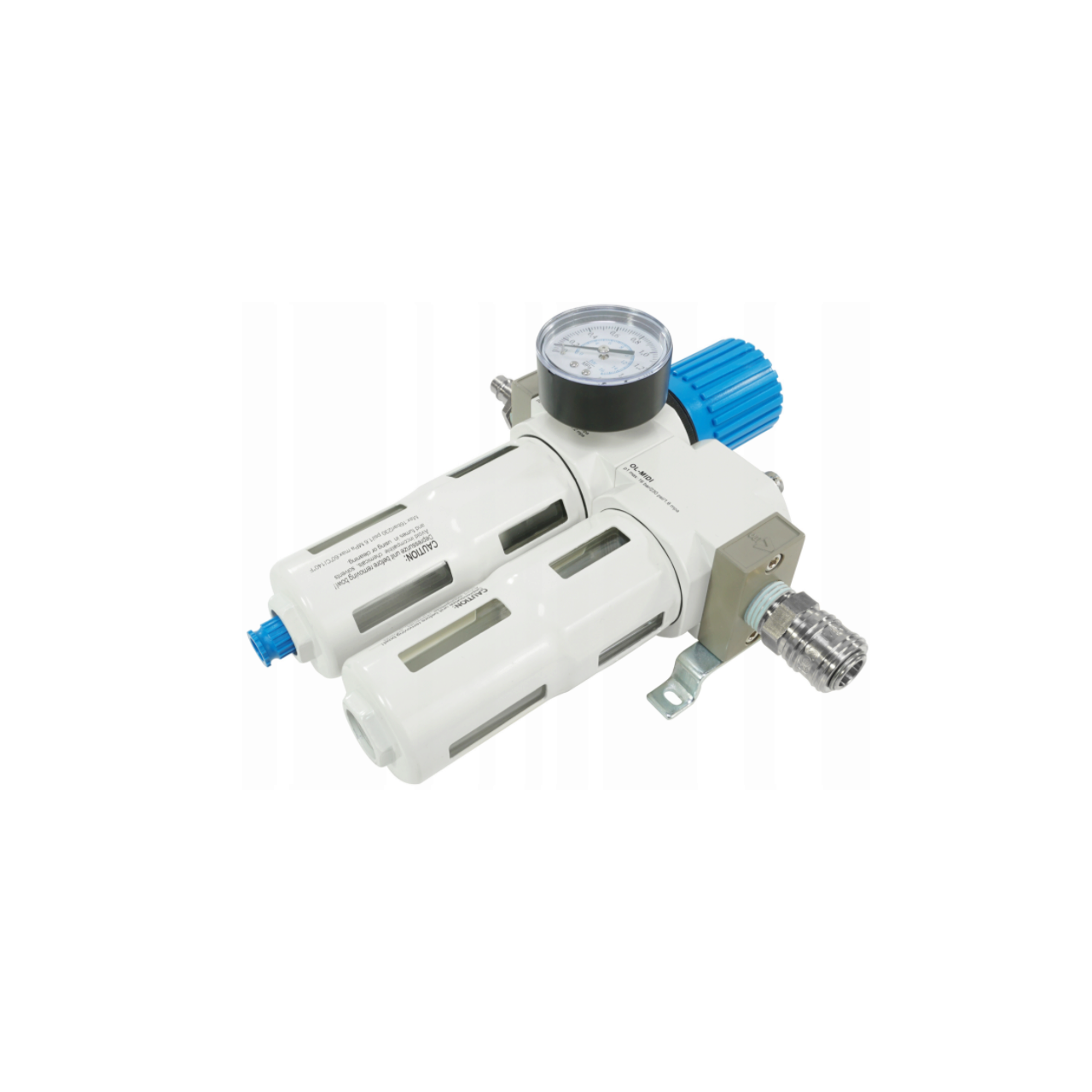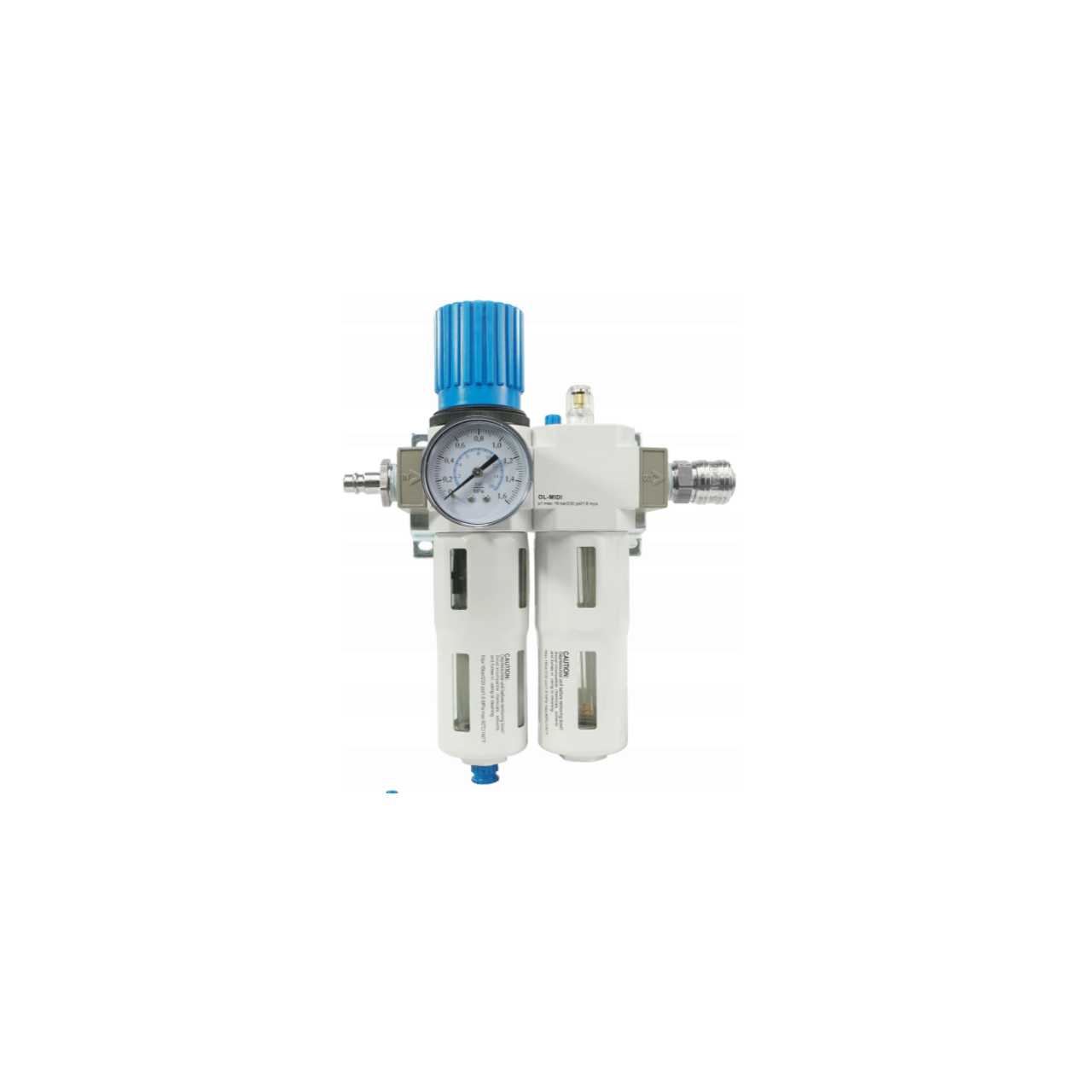 Un buton convenabil de pe reductorul filtrului este folosit pentru a seta presiunea. Butonul are un blocaj care protejează împotriva schimbării neintenționate a setării - înainte de reglare, trebuie deblocat trăgându-l în sus. Domeniul de măsurare al manometrului este 0 - 16 bar. Cadranul este gradat în bare cu o gradare cu o precizie de 0,2 bar. Manometrul poate fi instalat în portul de pe carcasa reductorului filtrului - puteți alege între două conexiuni: față sau spate. Conectați portul nefolosit cu ștecherul furnizat. Setul vine cu un suport de montare spate cu șuruburi. Setul include o cuplare rapidă și o mufă.