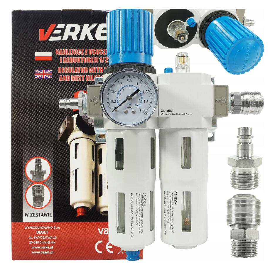 Set din două piese de la VERKE pentru utilizare într-un sistem pneumatic. Este format dintr-un modul reductor de filtru și un dozator de ulei. Îndeplinește următoarele funcții: