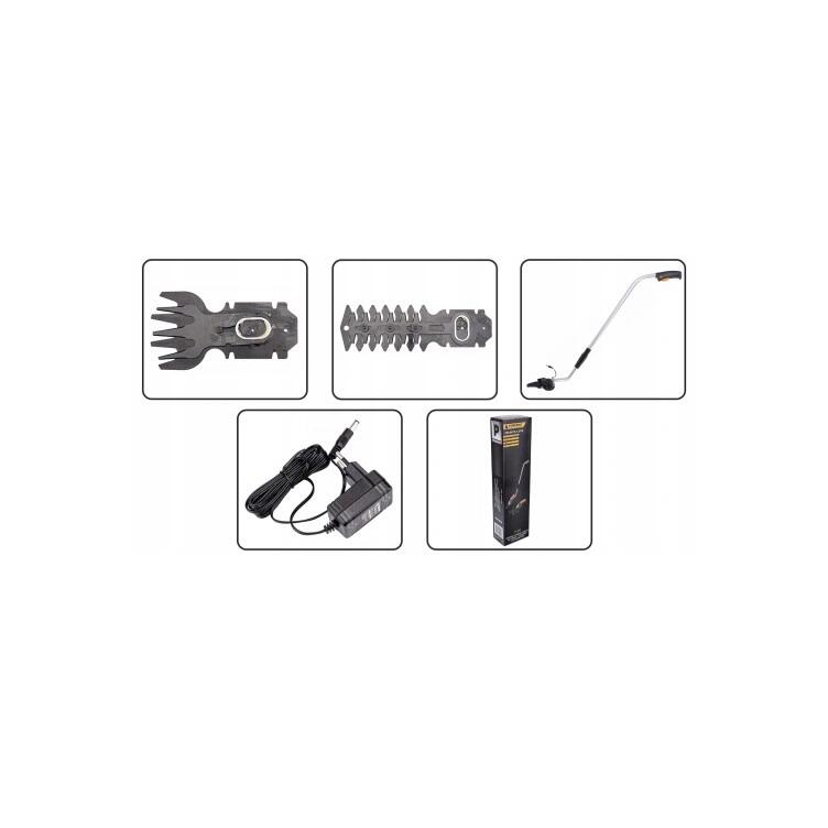 Setul include o lama de tuns iarba de 83 mm latime si o lama de tuns arbusti de 120 mm lungime, cu pasul dintilor de 6 mm.