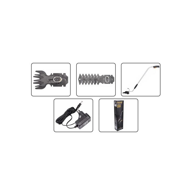 Setul include o lama de tuns iarba de 83 mm latime si o lama de tuns arbusti de 120 mm lungime, cu pasul dintilor de 6 mm.