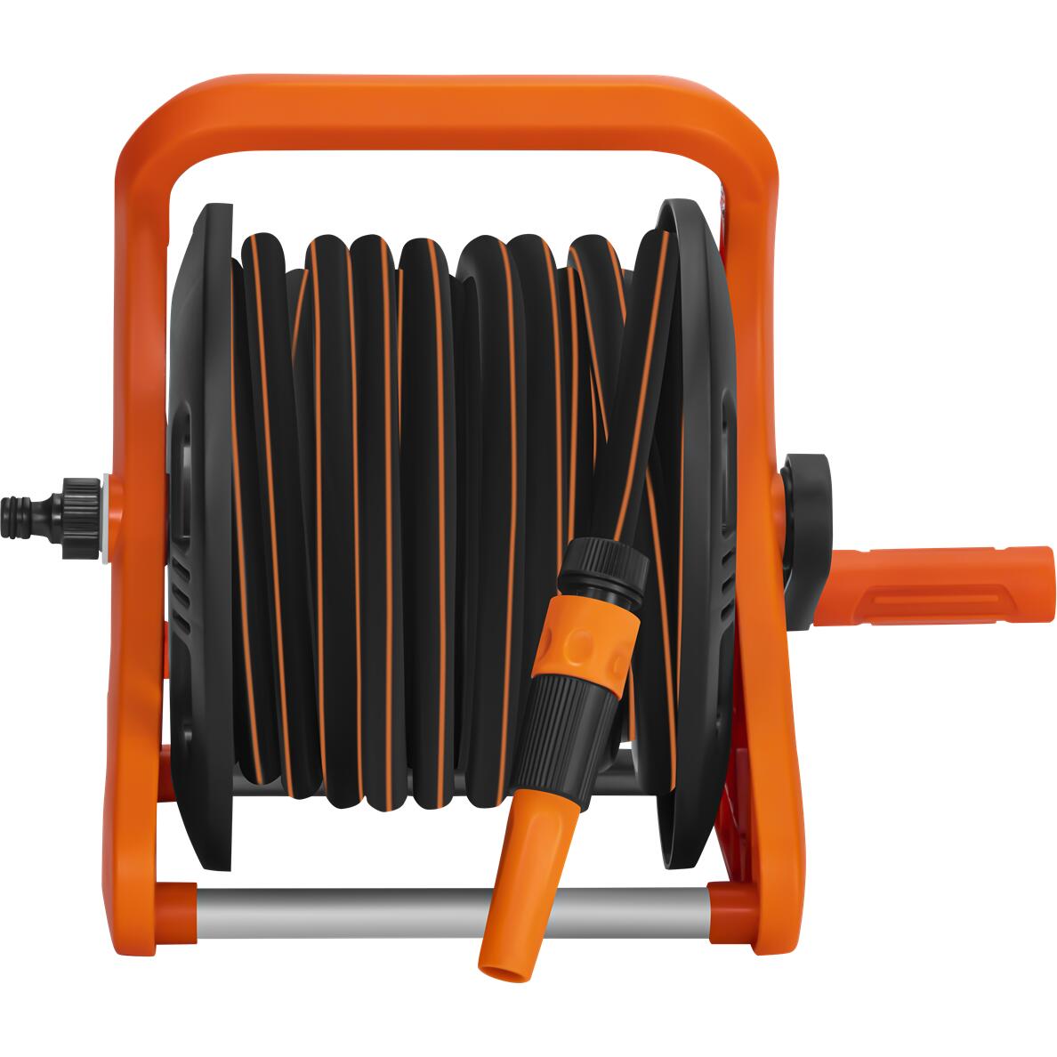 Designul suportului asigură o stabilitate ridicată datorită tuburilor solide din aluminiu și unui centru de greutate jos. Un mâner ergonomic îl face ușor de transportat, iar o manivelă permite reînfășurarea rapidă și convenabilă a furtunului după utilizare. Sistemul de reînfășurare previne încurcarea și îndoirea furtunului, asigurând o durată de viață mai lungă. Întregul suport este fabricat din materiale rezistente la intemperii și la raze UV, fiind potrivit pentru utilizarea regulată în grădină.
