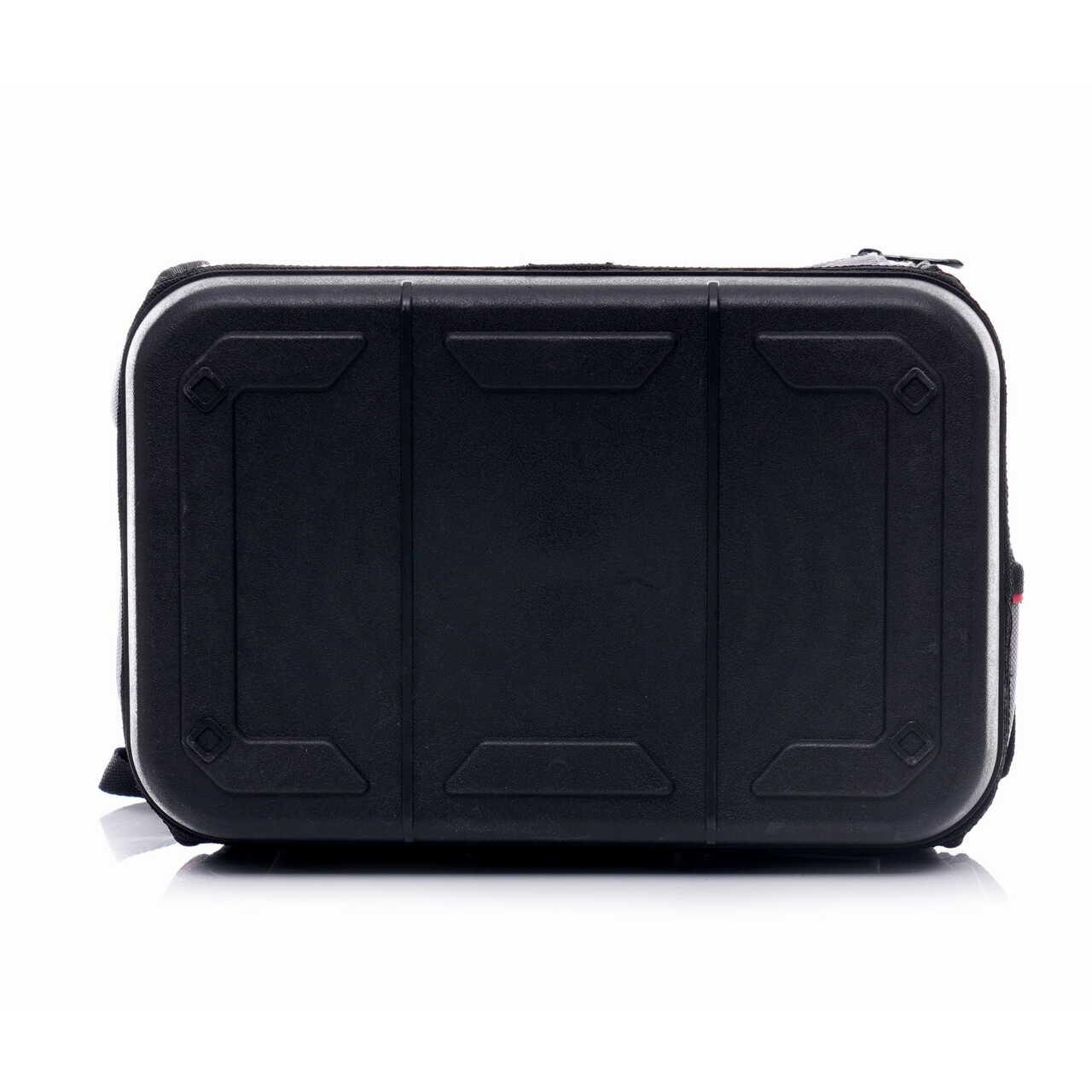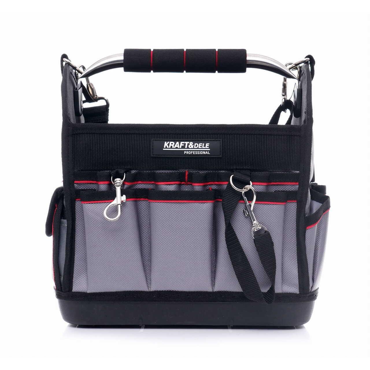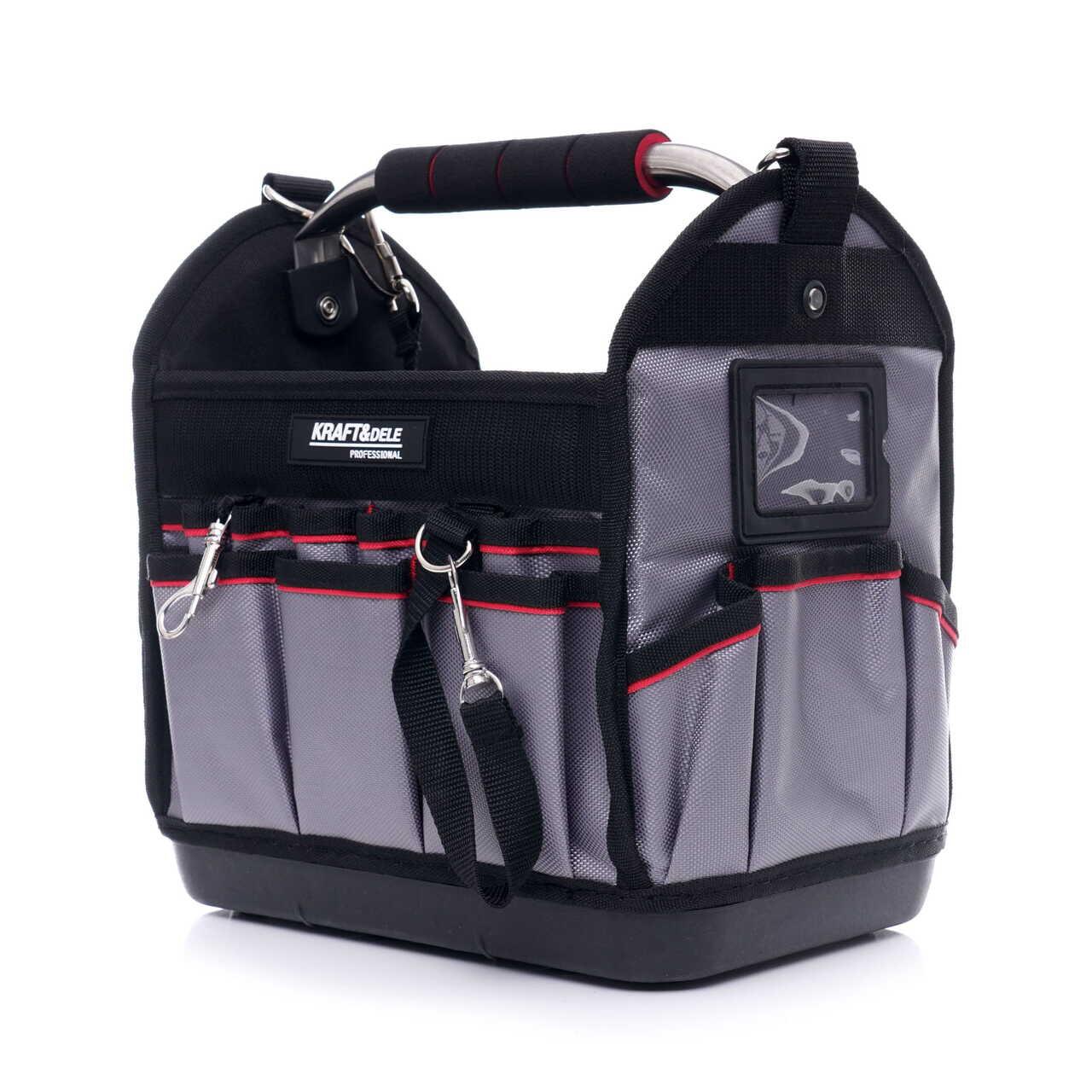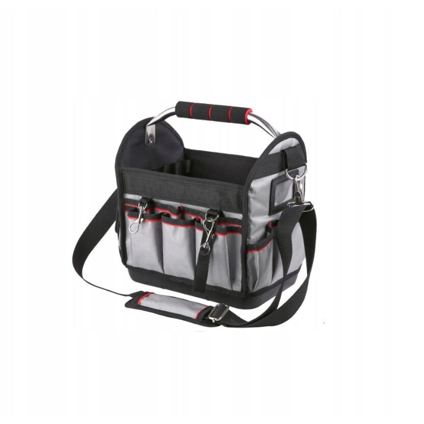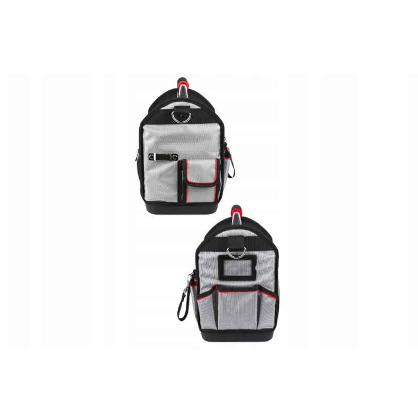 Fundul rigid acoperit cu material compozit asigură durabilitate, iar numeroasele buzunare asigură ordinea și accesul rapid la sculele necesare.