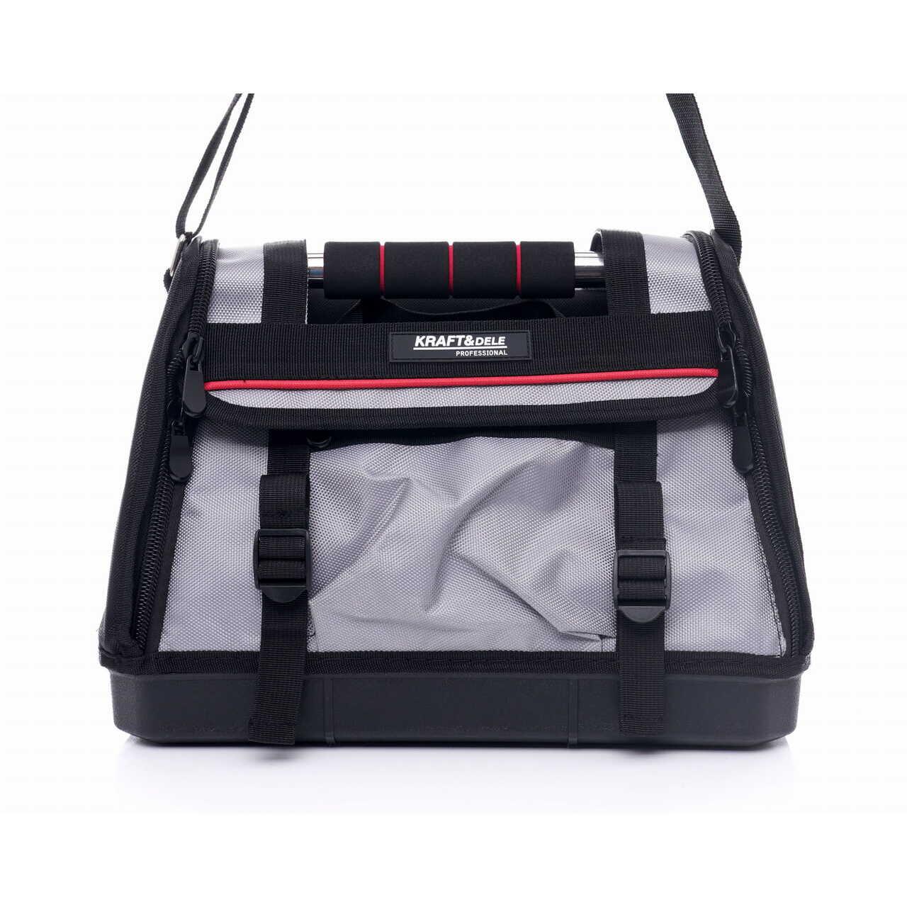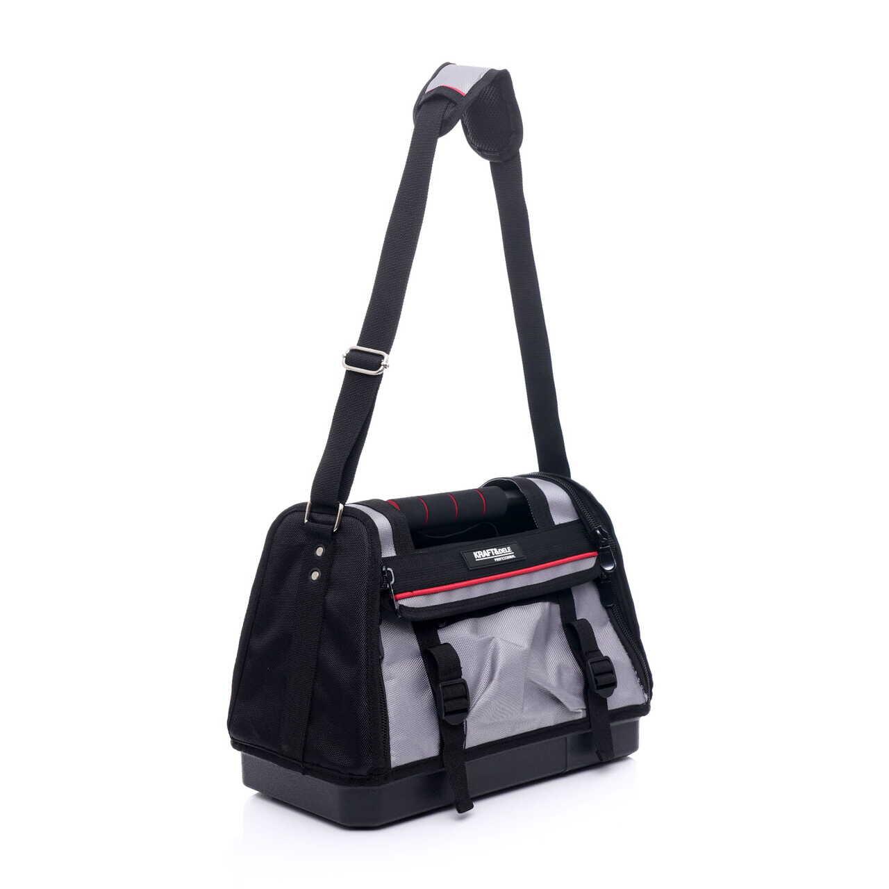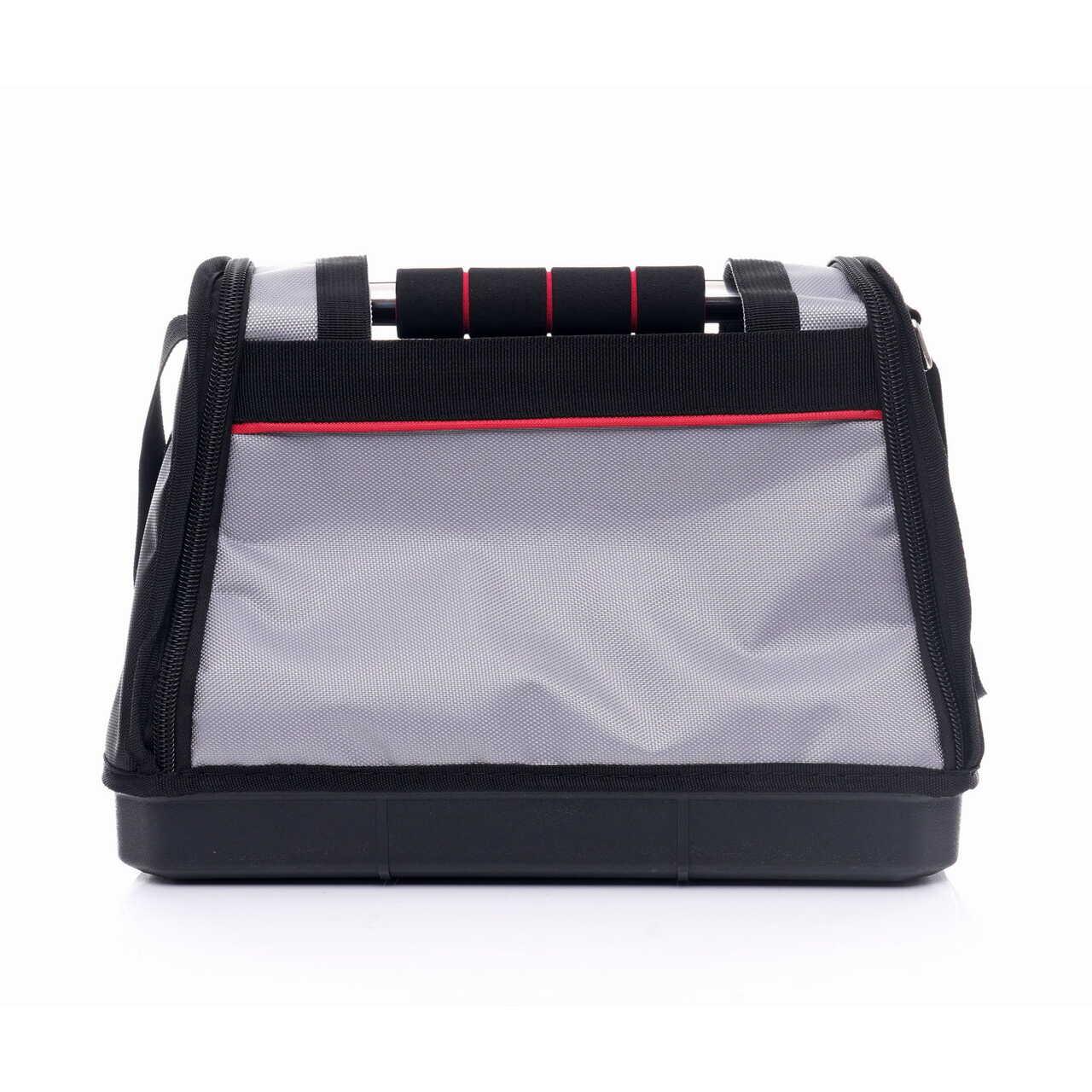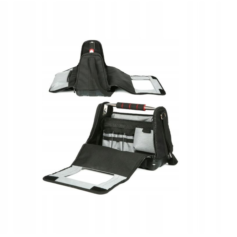 Fundul rigid acoperit cu material compozit asigură durabilitate, iar numeroasele buzunare asigură ordinea și accesul rapid la sculele necesare.