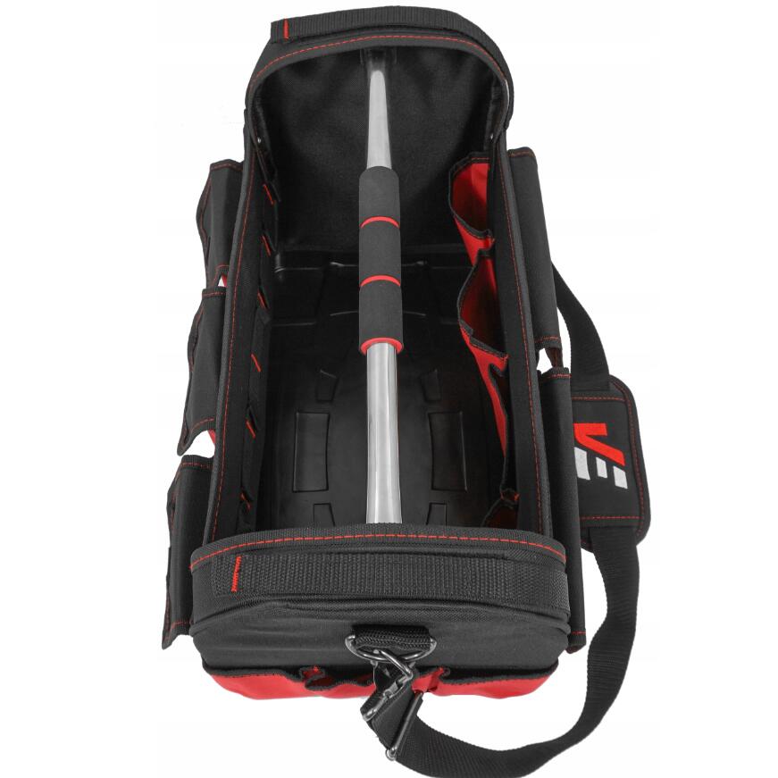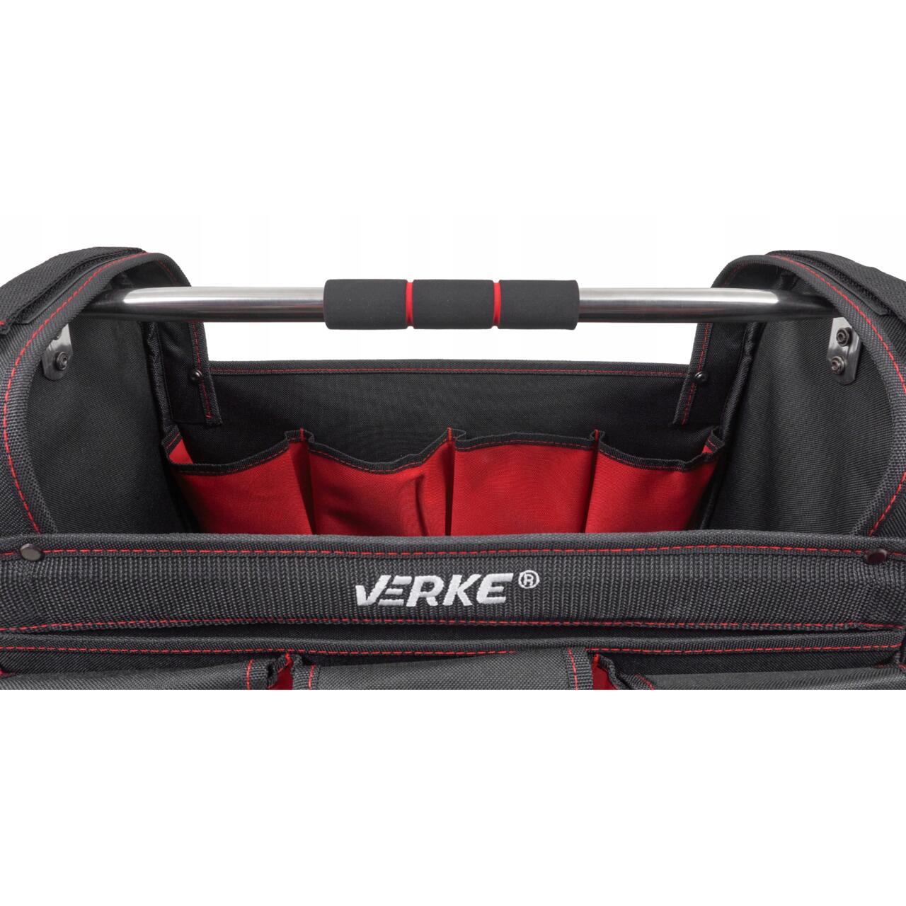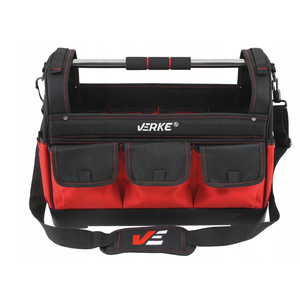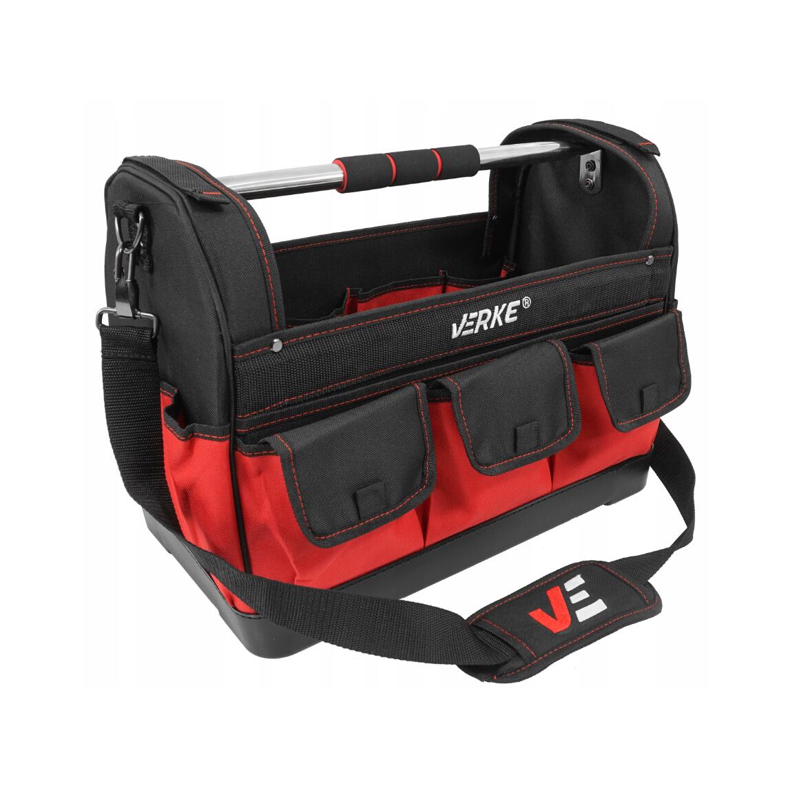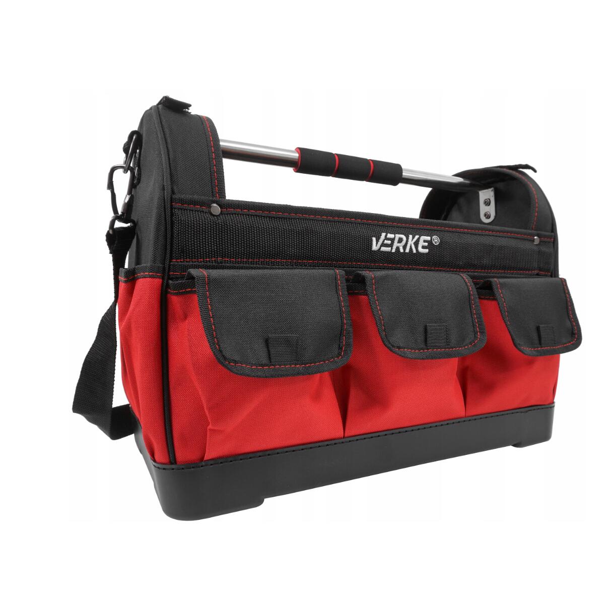 Geanta deschisă pentru scule Verke este ideală pentru depozitarea și transportul uneltelor și accesoriilor pe șantier, garaj sau atelier. Se caracterizează printr-o structură rigidă, ceea ce o face foarte la îndemână și practică. Echipat cu o bară transversală cu mâner anti-alunecare pentru un transport mai comod. Are buzunare interne și externe pentru depozitarea șurubelnițelor, cleștilor și a altor unelte mici. Un compartiment mare oferă acces comod la unelte. Cusături realizate într-o versiune întărită, adaptată la sarcini grele. Material poliester 600D. Are un fund rigid și o curea de umăr.