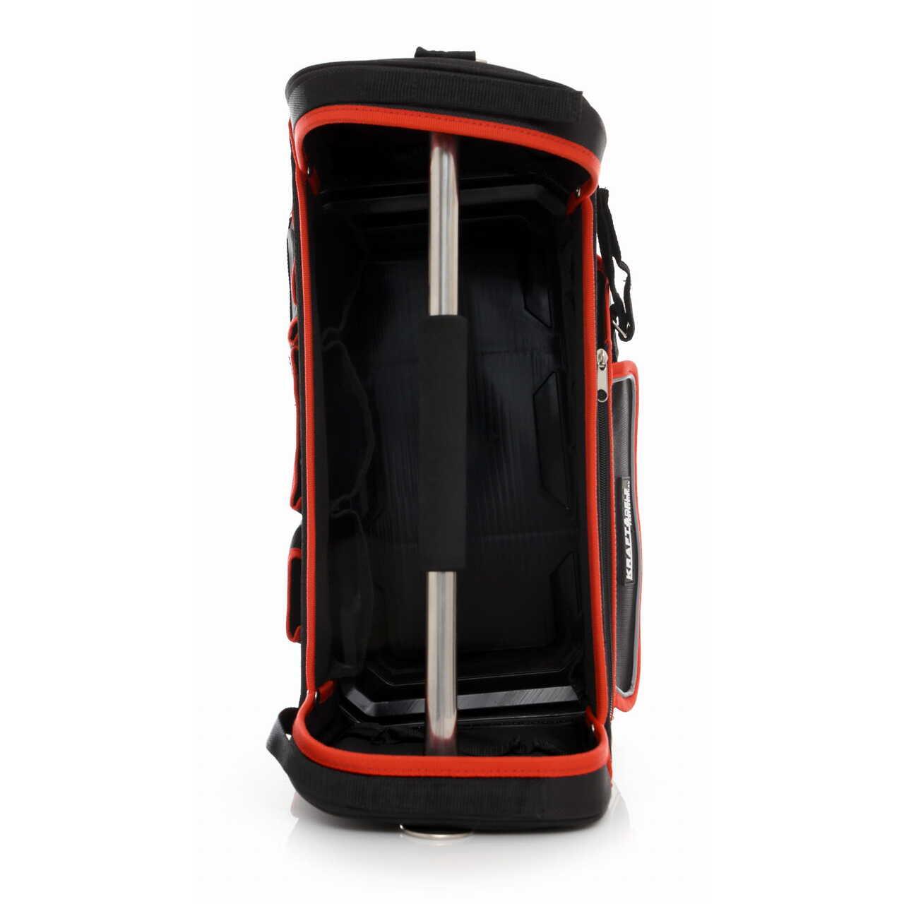 Fundul rigid acoperit cu material compozit asigură durabilitate, iar numeroasele buzunare asigură ordinea și accesul rapid la sculele necesare.