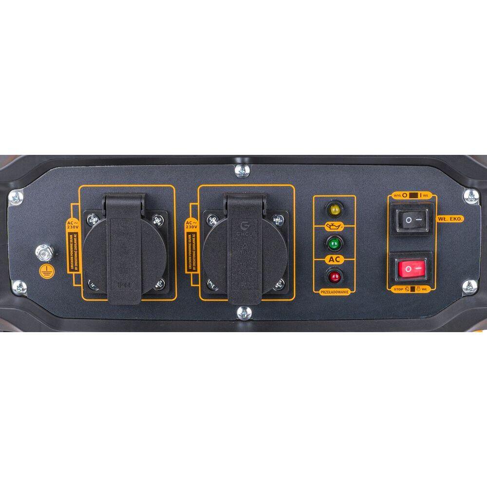 Generatorul produce energie electrică cu o tensiune de 230V (2 prize). Soluția perfectă pentru o întrerupere de curent în câmp. Echipat cu voltmetru și siguranțe. Unitatea are un senzor de nivel de ulei care va opri automat motorul dacă nivelul acestuia este prea scăzut. Pornirea manuală a unității - cu un cablu. Unitatea este utilizată în meșteșuguri, construcții pe terenuri și grădini pentru lucrul cu scule electrice, pompe, iluminat.