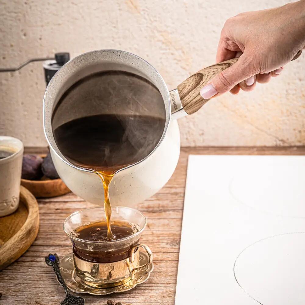 KingHoff KH-1982 este o cafetieră turcească încăpătoare și elegantă, creată pentru iubitorii de arome intense, textură catifelată și mod tradițional de preparare a cafelei. Cu o capacitate de până la 1,8 litri, puteți prepara o porție de cafea pentru întreaga familie sau pentru un grup mai mare de invitați. Învelișul antiaderent marmorat, gura de scurgere precisă și mânerul cu aspect de lemn fac ca prepararea zilnică să fie rapidă, convenabilă și extrem de plăcută.
