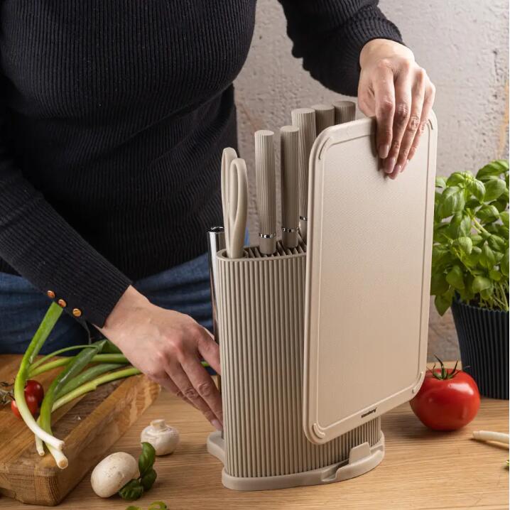 Totul într-unul - cuțite, foarfece, placă și suport pentru prosoape într-un suport compact.