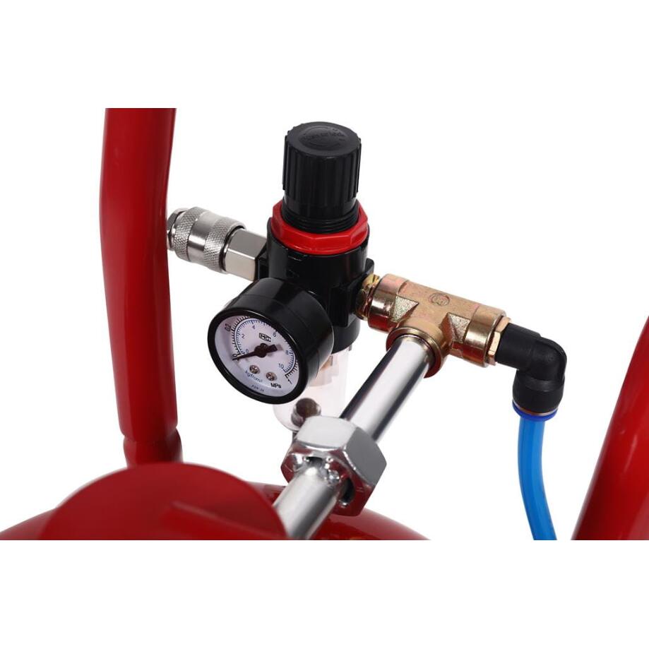 Întreaga unitate este montată pe un suport practic cu roți, permițând o deplasare ușoară. Setul include și furtunul de aer necesar pentru conectarea rapidă la un compresor.