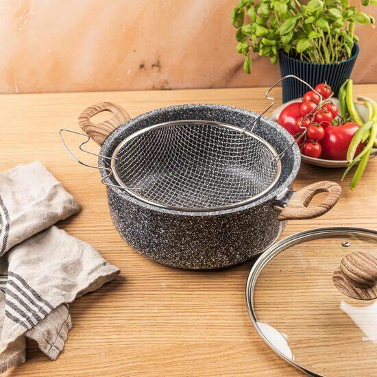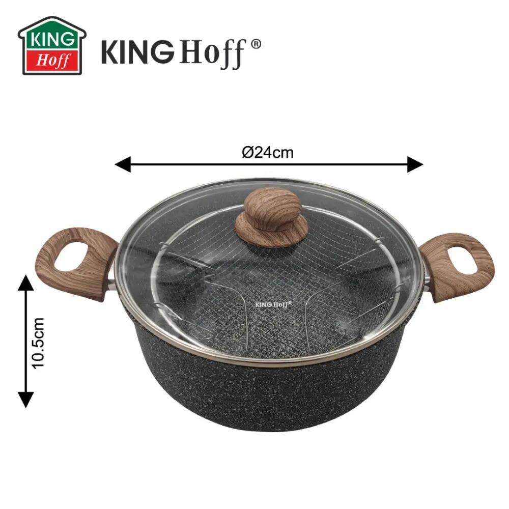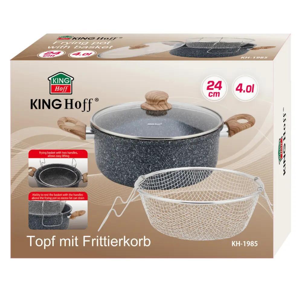 KingHoff KH-1985 este o oală versatilă de 4 litri, care vă permite să prăjiți, să gătiți, să înăbușiți și să scurgeți alimentele într-o singură oală.